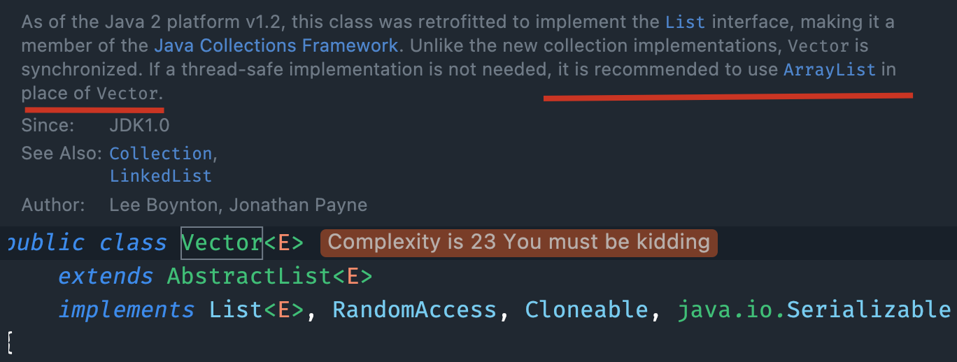 }这种加了同步方法的类,注定会被淘汰掉,就像StringBuilder 取代 StringBuffer那样。JDK 源码也说了: