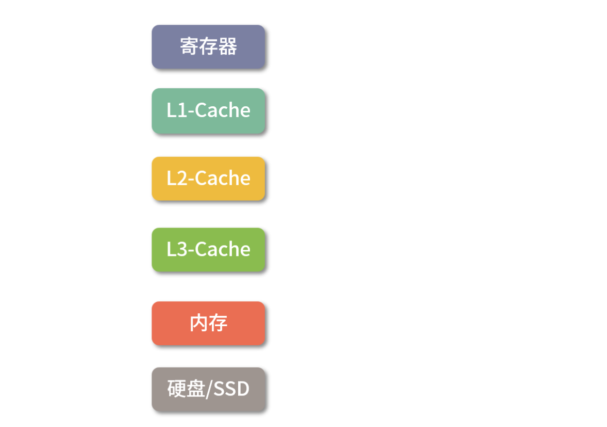 存储器存储空间大小:内存>L3>L2>L1>寄存器;