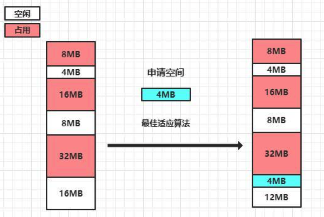 最佳适应算法导致大量碎片,最坏适应算法导致没有大的空间。