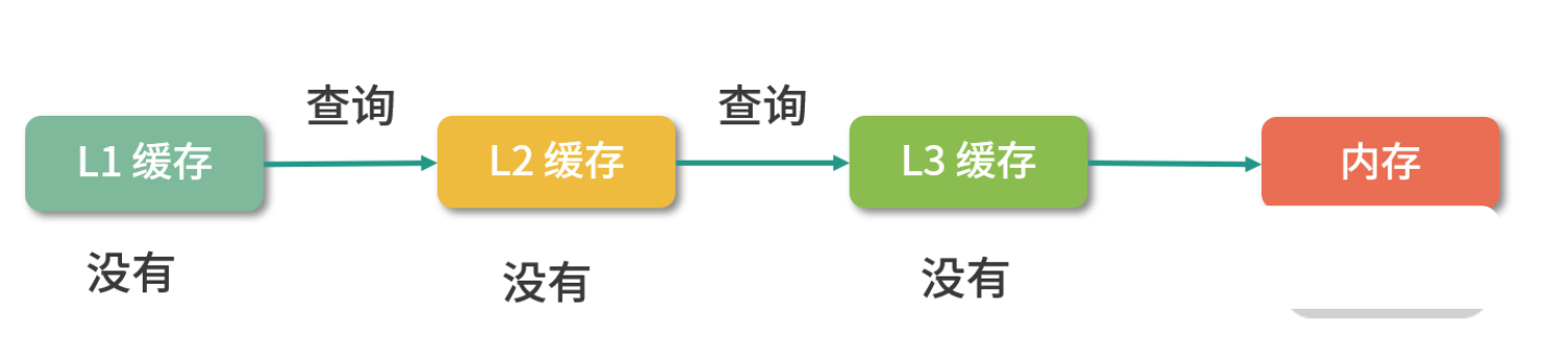 当 CPU 需要内存中某个数据的时候,如果寄存器中有这个数据,我们可以直接使用;如果寄存器中没有这个数据,我们就要先查询 L1 缓存;L1 中没有,再查询 L2 缓存;L2 中没有再查询 L3 缓存;L3 中没有,再去内存中拿。