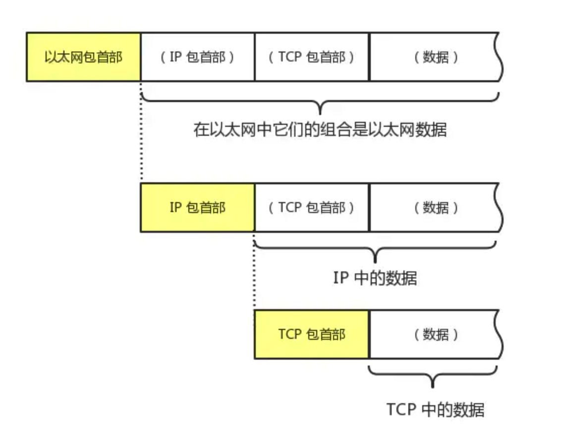 在传输层,TCP协议会将HTTP协议发送的数据看作一个数据包,并在这个数据包前面加上TCP包的一部分信息(部首)