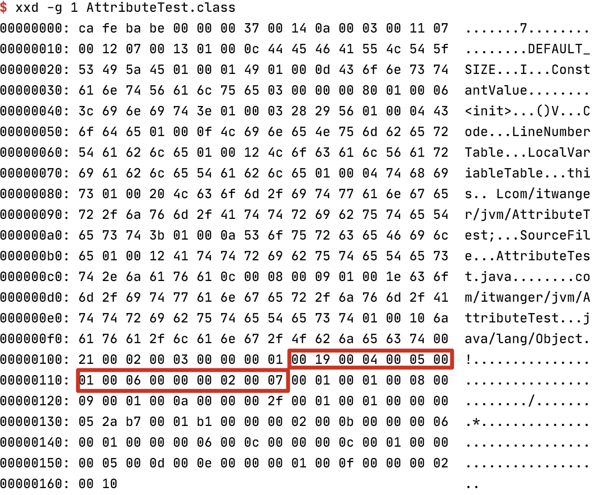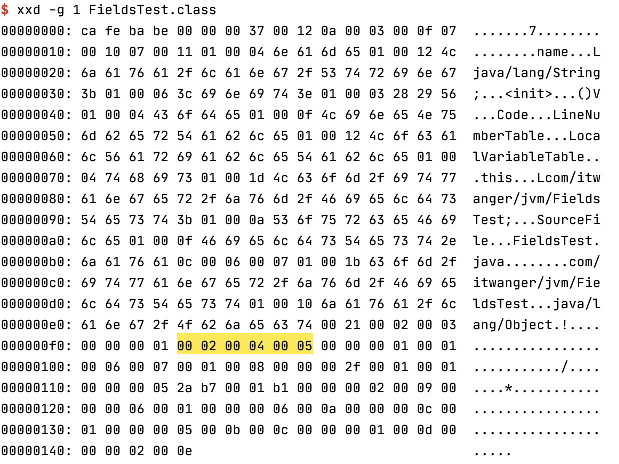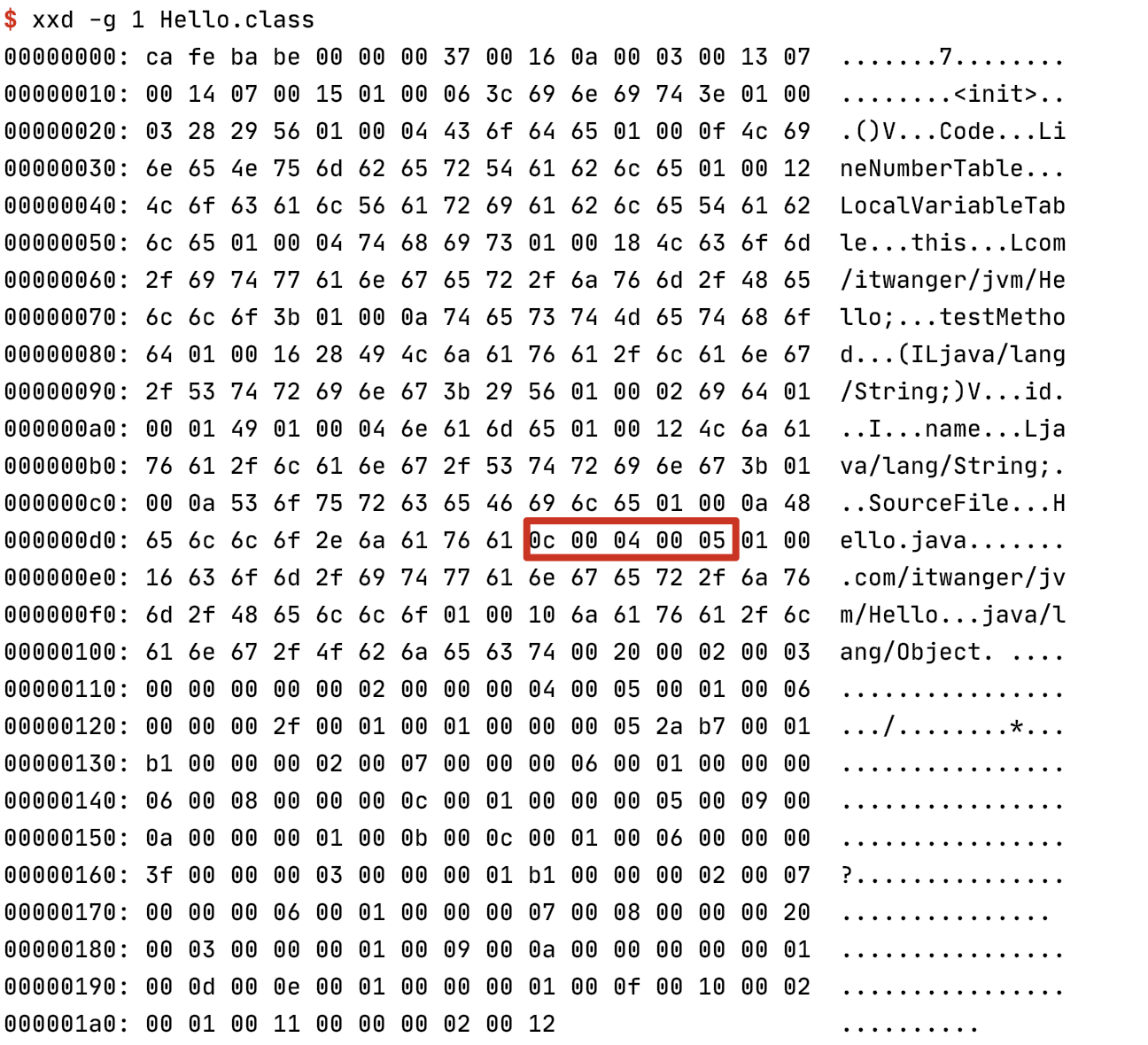 可以在终端中通过 xxd Hello.class 命令来查看(前面我们已经讲过了,大家可以戳这个链接回看)。