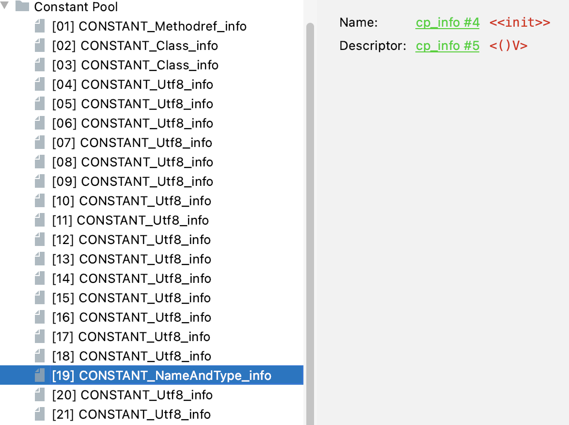}用 jclasslib 可以看到 CONSTANT_NameAndType_info 包含的索引有两个。