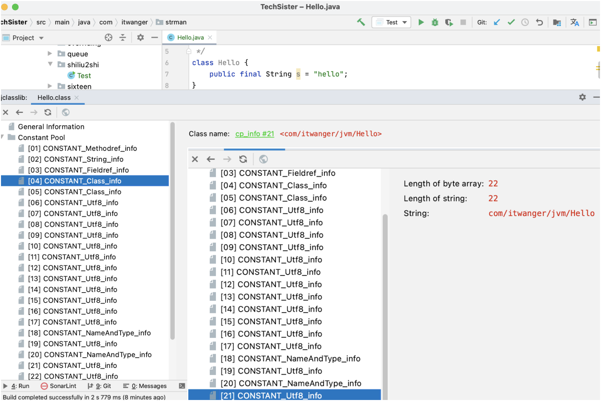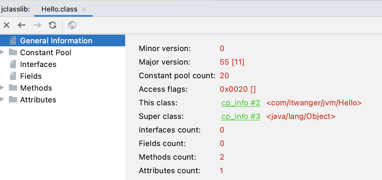 从上图中可以看到,常量池的总大小为 23,索引为 04 的 CONSTANT_Class_info 指向的是是索引为 21 的 CONSTANT_Uft8_info,值为 com/itwanger/jvm/Hello。21 的十六进制为 0x15,有了这个信息,我们就可以找到 CONSTANT_Class_info 在 class 文件中的位置了。