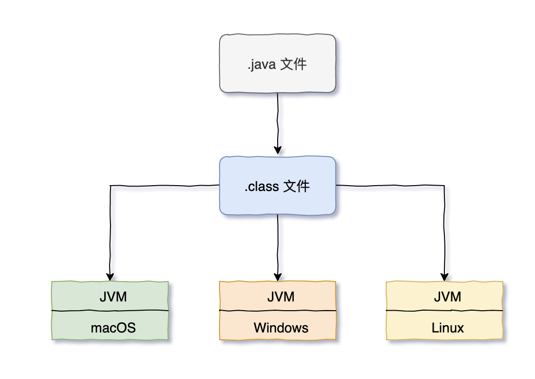 通过不同操作系统的 JVM,我们的源代码就可以不用根据不同的操作系统编译成不同的二进制可执行文件了,跨平台的目标也就实现了。