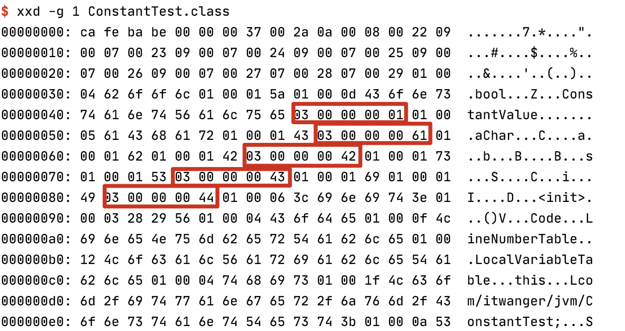 }布尔值 true 的十六进制是 0x01、字符 a 的十六进制是 0x61,字节 66 的十六进制是 0x42,短整型 67 的十六进制是 0x43,整型 68 的十六进制是 0x44。所以编译生成的整型常量在 class 文件中的位置如下图所示。