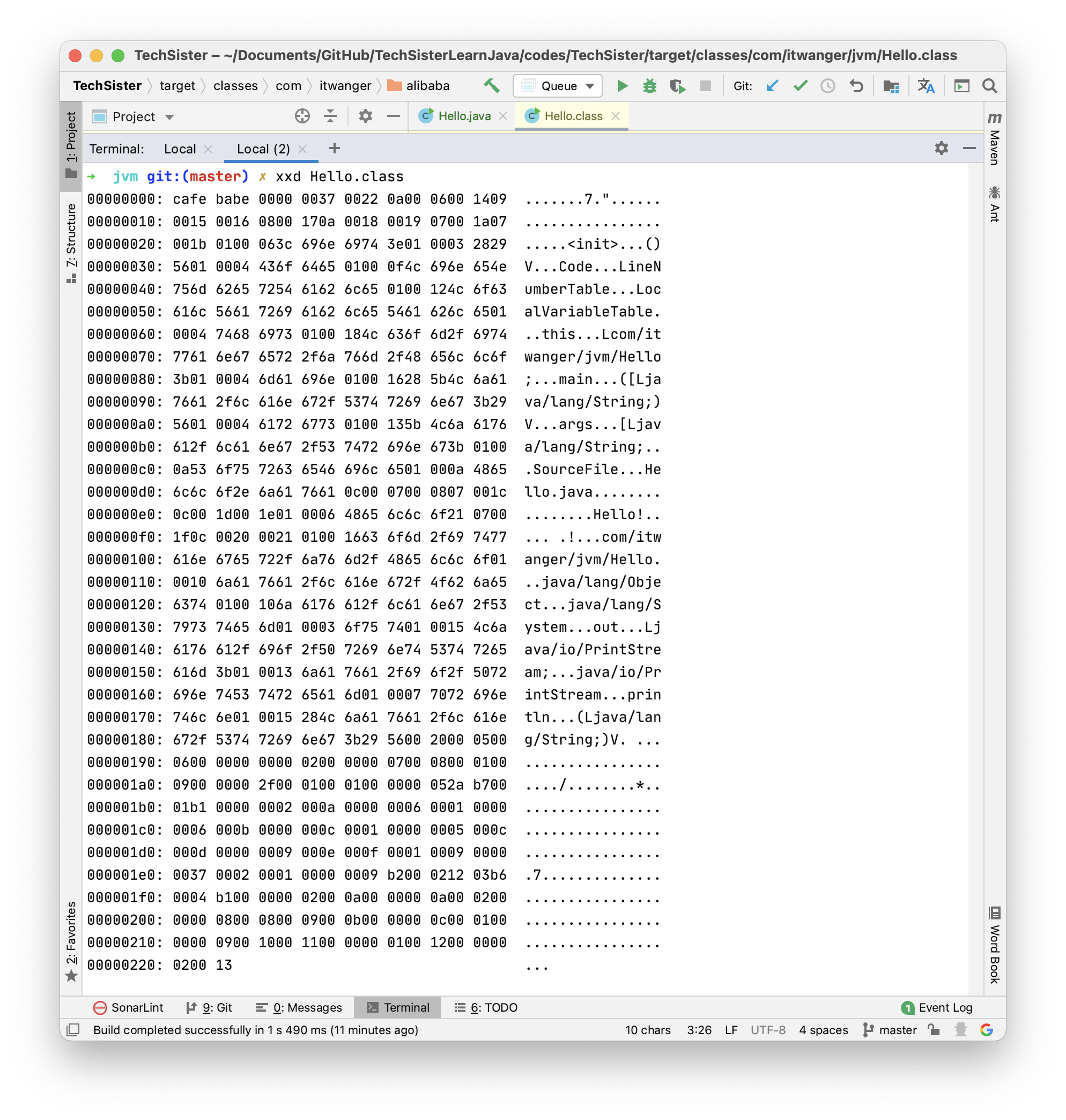 }点击编译按钮后(也不用主动点,IDEA 会自动编译),IDEA 会帮我们生成一个名为 Hello.class 的文件,在 target/classes 的对应包目录下。直接双击打开后长下面这样子: