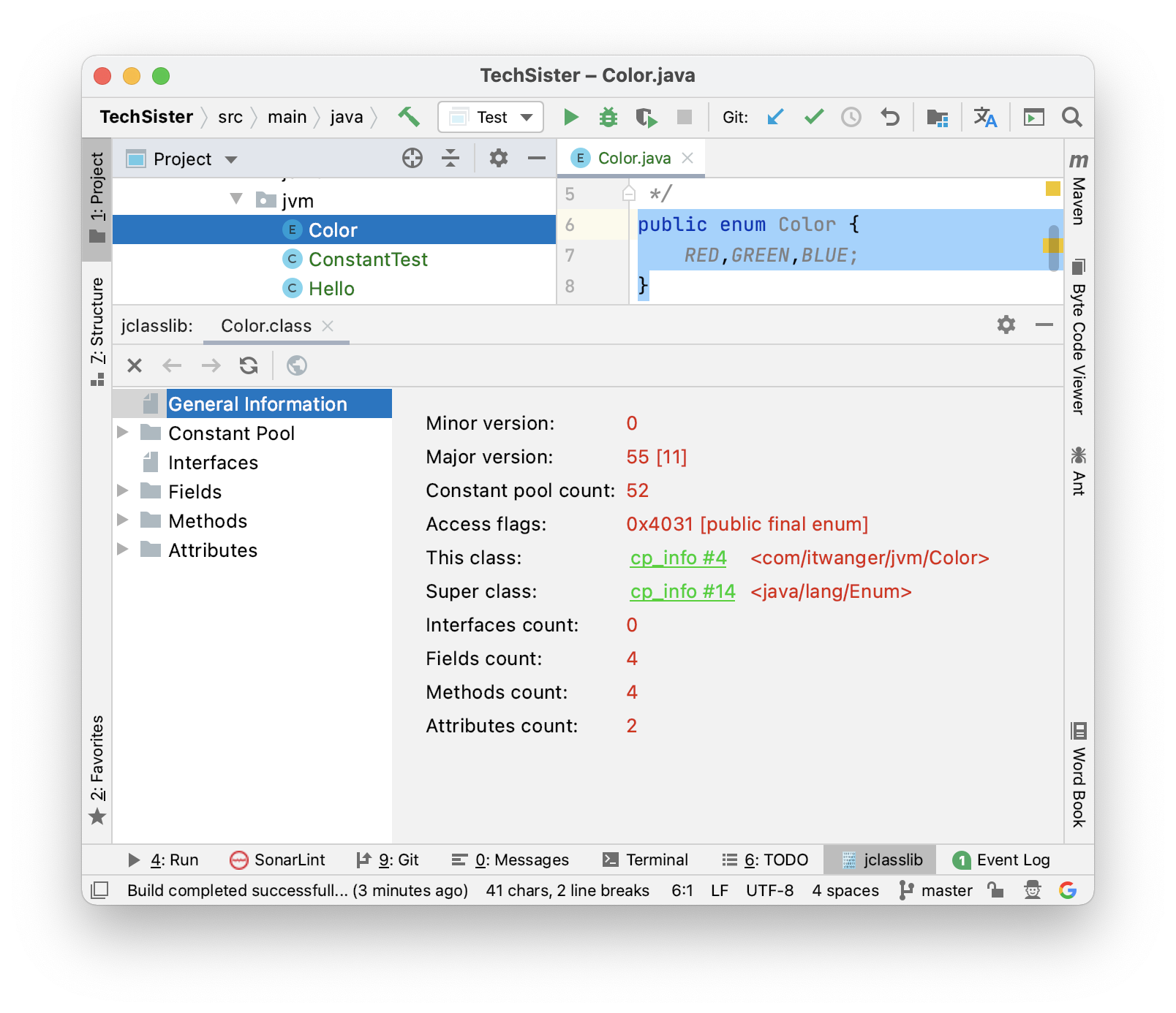 先不着急,这里给大家介绍一款可视化字节码的工具 jclasslib bytecode viewer(前面也曾讲过),可以直接在 IDEA 的插件市场安装。安装完成后,选中 class 文件,然后在 View 菜单里找到 Show Bytecode With Jclasslib 子菜单,就可以查看 class 文件的关键信息了。