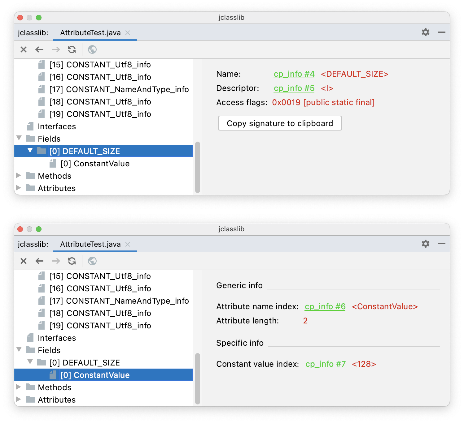 }只有一个常量 DEFAULT_SIZE,它属于字段中的一种,就是加了 final 的静态变量。先通过 jclasslib 看一下它当中一个很重要的属性——ConstantValue,用来表示静态变量的初始值。