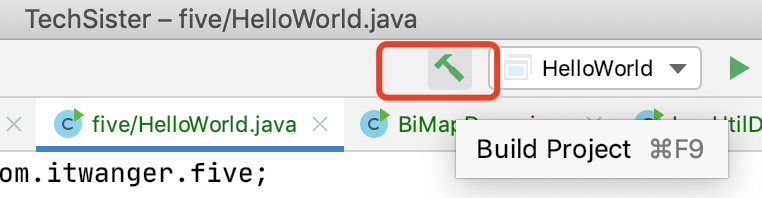 }点击 IDEA 工具栏中的锤子按钮(Build Project,编译整个项目),如下图所示。