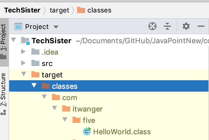 这时候,就可以在 src 的同级目录 target 下找到一个名为 HelloWorld.class 的文件。