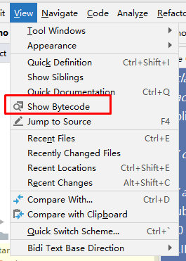 那这个字节码文件是怎么看到的呢?可以通过 IDEA 菜单栏中的「View」→「Show Bytecode」查看,如下图所示。