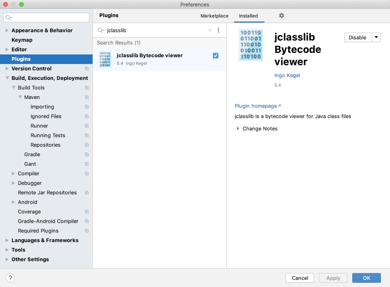 相比于 IDEA 自带的「Show Bytecode」功能,我更推荐 jclasslib 这款插件,可以在插件市场中安装(我已经安装过了)。