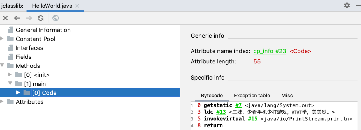 }是不是就有点懵逼了?新手看到这个很容易头大,不过不要担心,后面我再和大家一块深入研究一下,这里就是感受一下字节码的魅力。