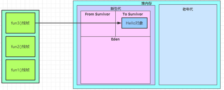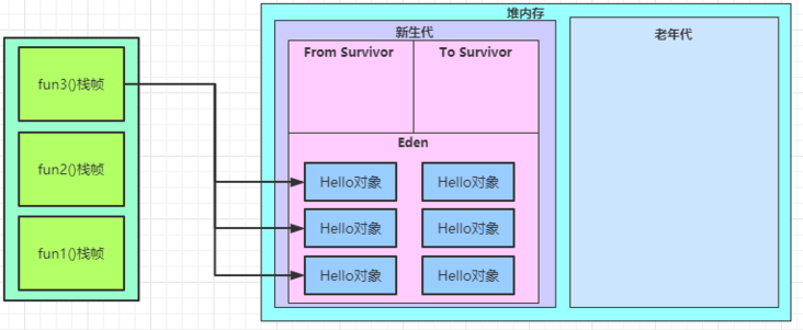 我们创建的大部分对象,都属于生命周期较短的对象,所以会存放在新生代。新生代又细分 Eden、From Survivor、To Survivor,那我们创建的对象会优先在 Eden 区分配,见下图。