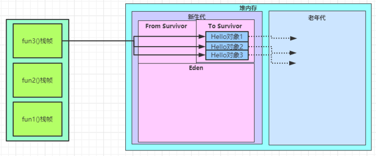 比如 Survivor 是 100M,Hello1 和 Hello2 都是 3 岁,且总和超过了 50M,Hello3 是 4 岁,这个时候,这三个对象都将到老年代。