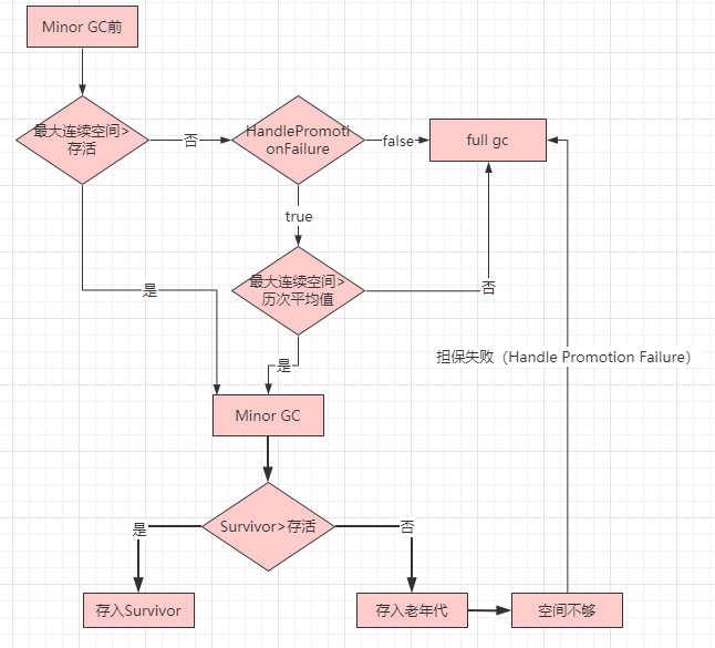 - 如果大于,发起 Minor GC。Minor GC 后,看 Survivor 空间是否足够存放存活对象,如果不够,就放入老年代,如果够放,就直接存放 Survivor 空间。如果老年代都不够放存活对象,担保失败(Handle Promotion Failure),发起 Full GC。