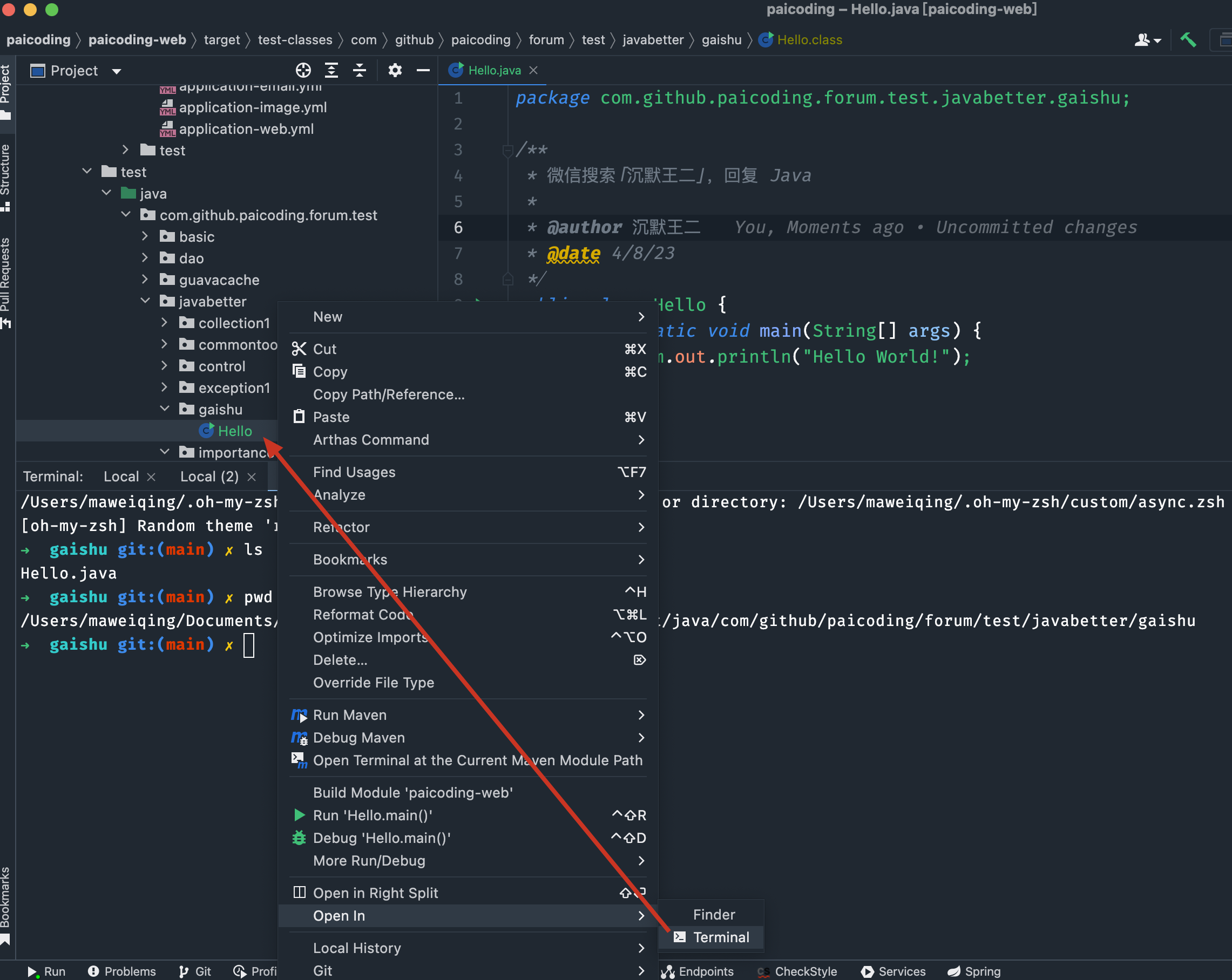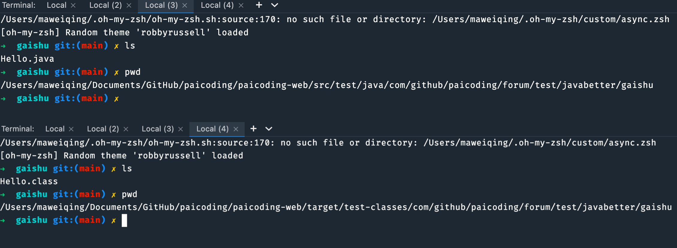 在 Intellij IDEA 的 terminal 面板中,可以看到对应的 java 源代码文件和编译后的 .class 文件。