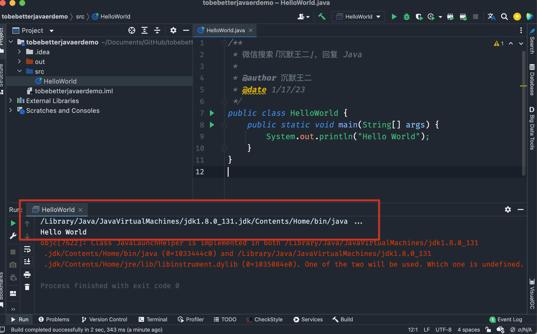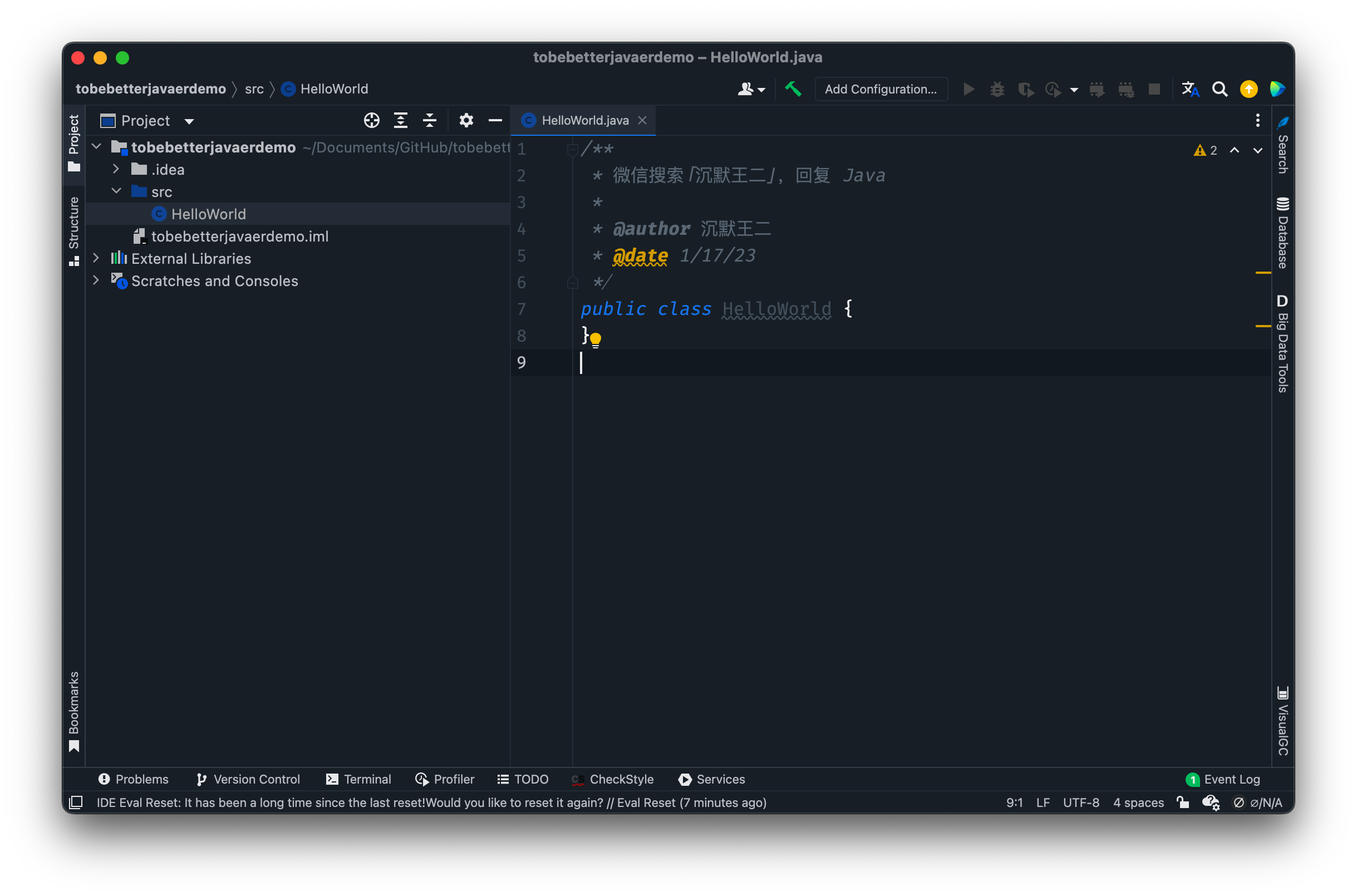 注释是二哥配置好的,你如果没配置可能没有,public class HelloWorld {} 是 Intellij IDEA 帮我们自动生成的。