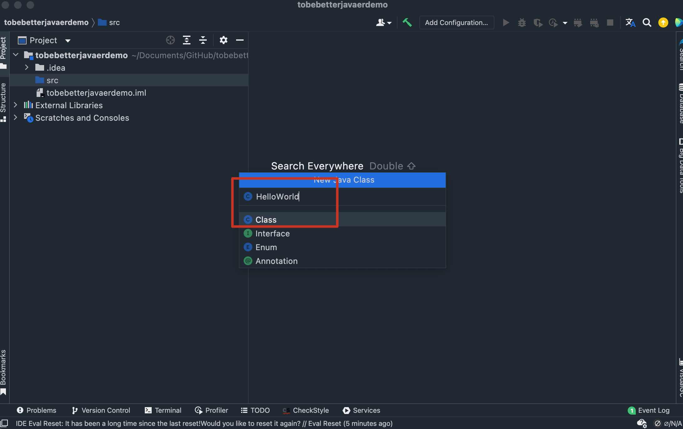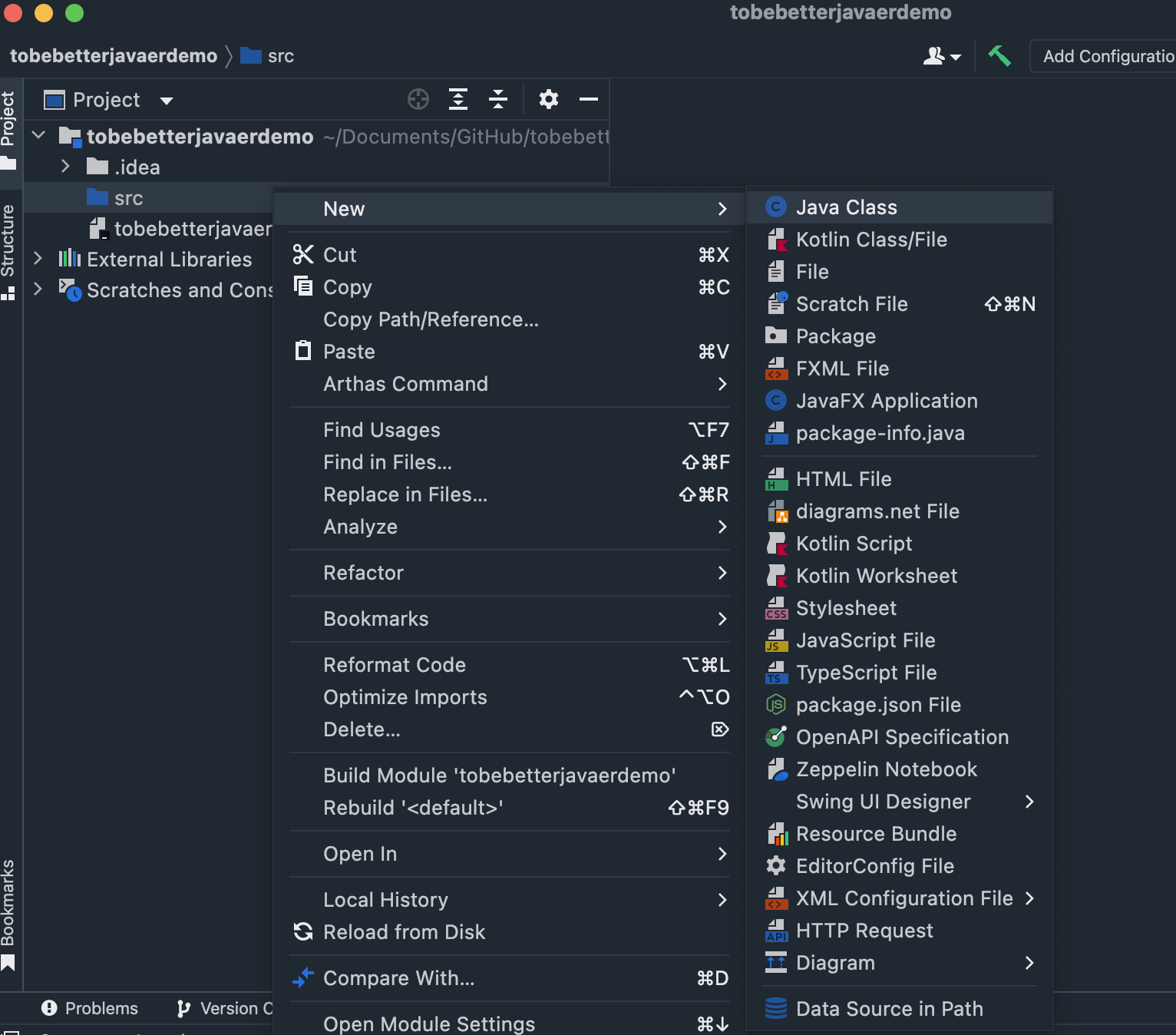 右键 src 目录,在菜单中依次选择 New → Java Class。
