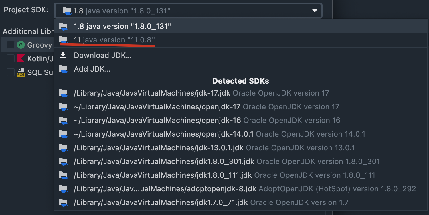 你也可以选择 JDK 11 或者最新的 JDK 17 或者添加新的 JDK 版本,但(不建议)。