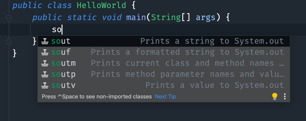 然后在 main 方法中键入 so 等出现提示后键入 enter 键。