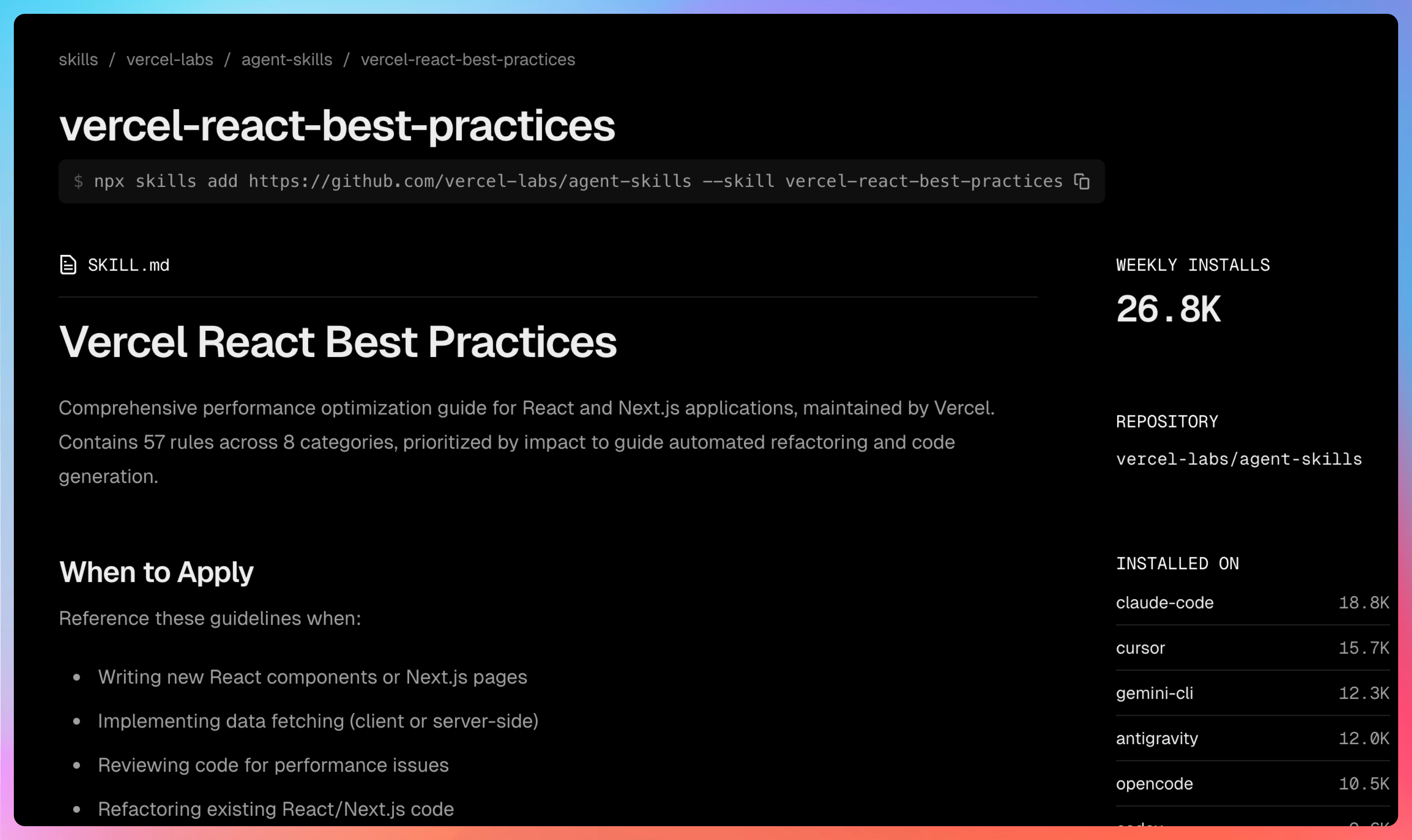 举个例子,vercel-react-best-practices 这个 Skill 目前安装量 43.3K,排在整个榜单的第一名。