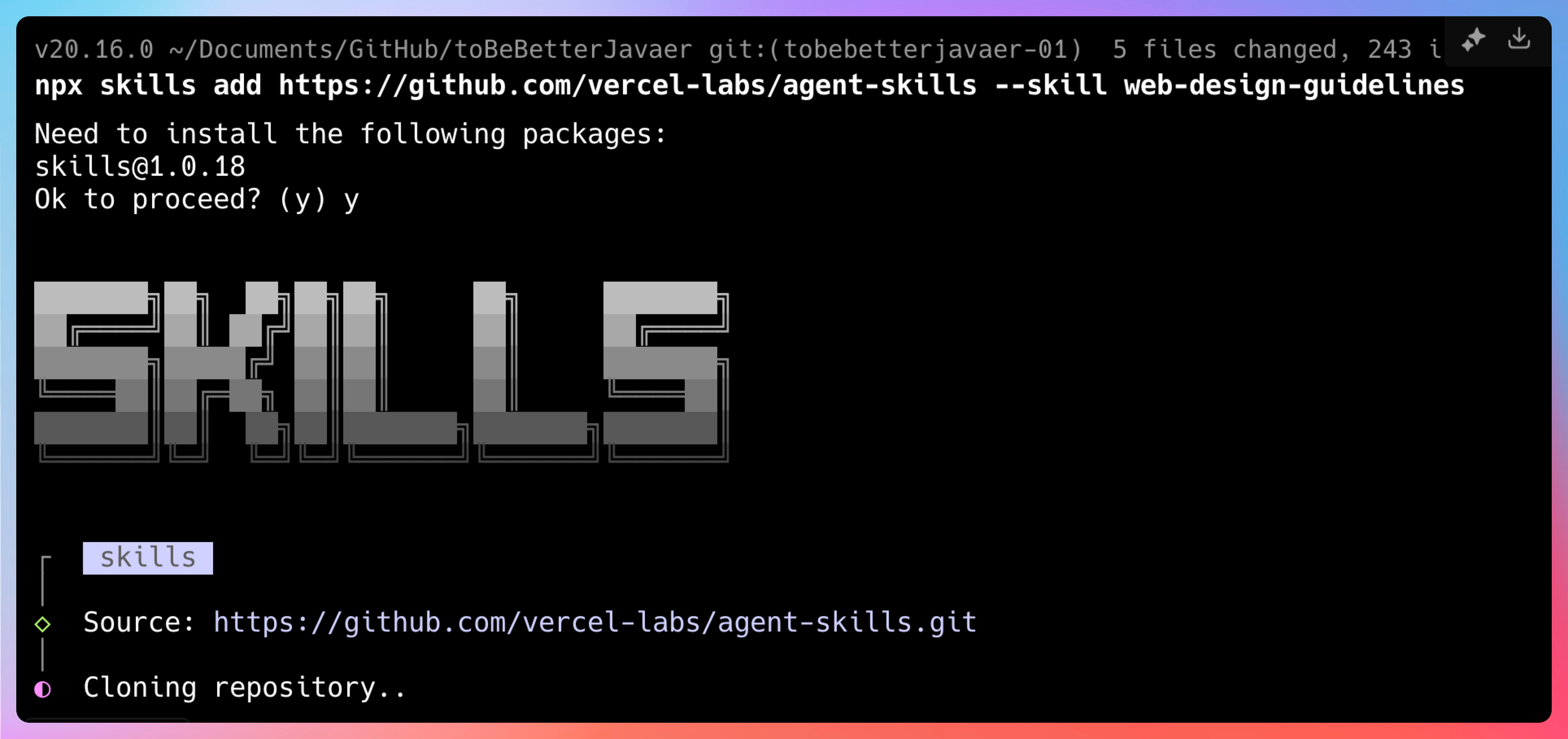 npx skills add vercel-labs/agent-skills这个命令会做几件事:克隆对应的 Git 仓库、把 Skill 配置写入你的项目、如果有依赖的话会自动安装。