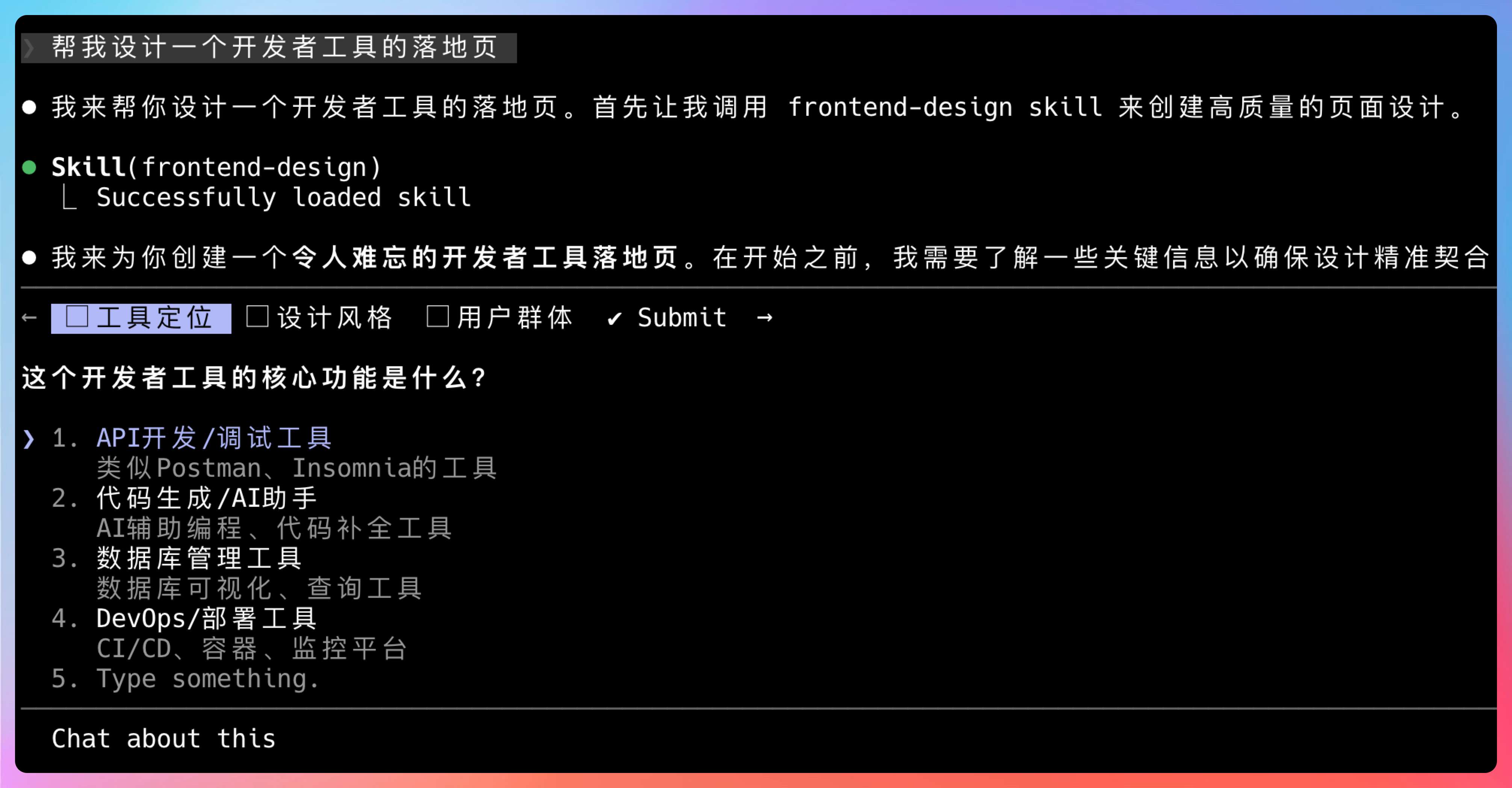 我问它「帮我设计一个开发者工具的落地页」,它不是直接给我代码,而是先问我的目标用户是什么、核心卖点有哪些、希望用户有什么样的情绪体验。这些问题问得还挺专业的,明显有产品思维在里面。