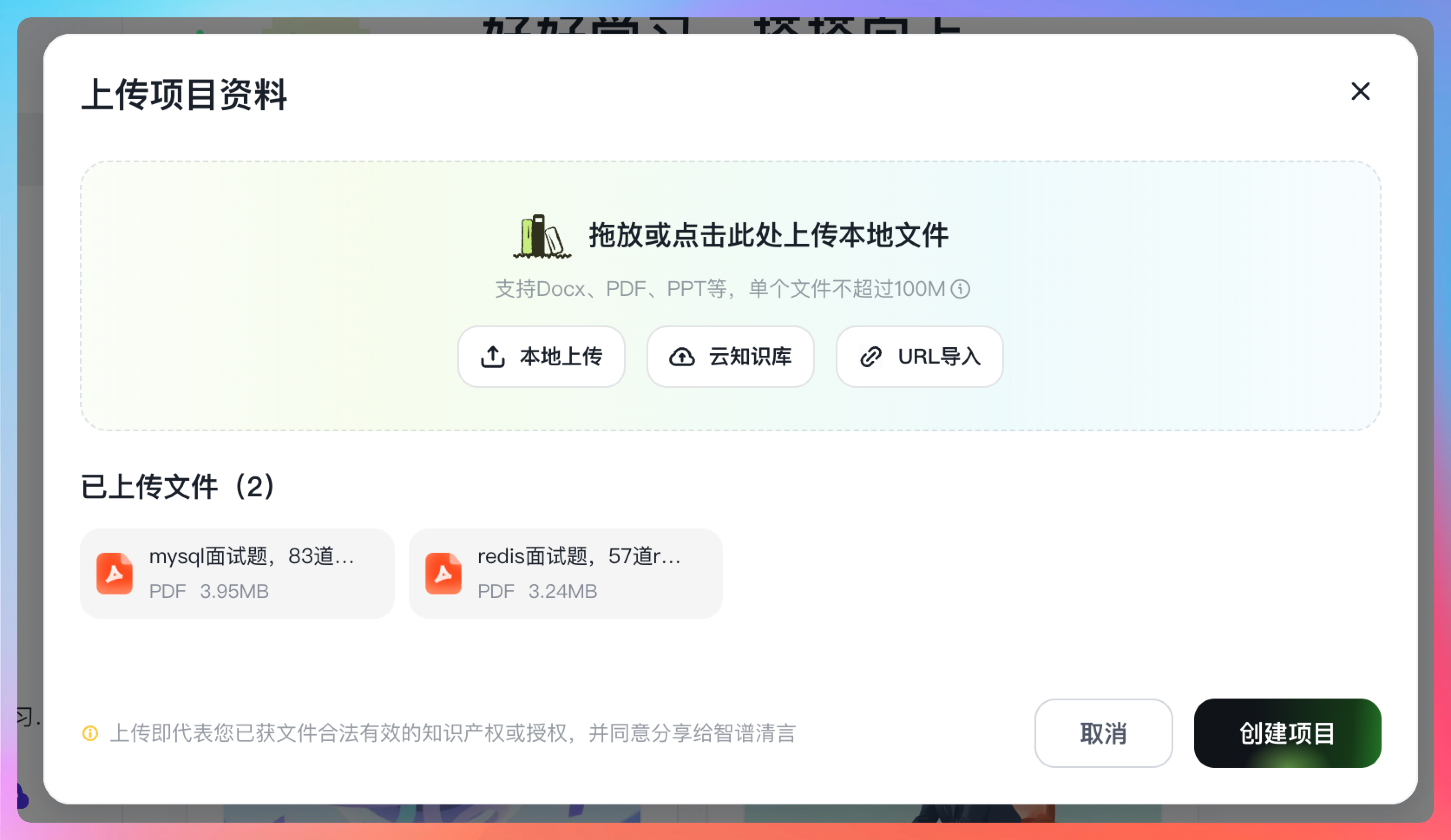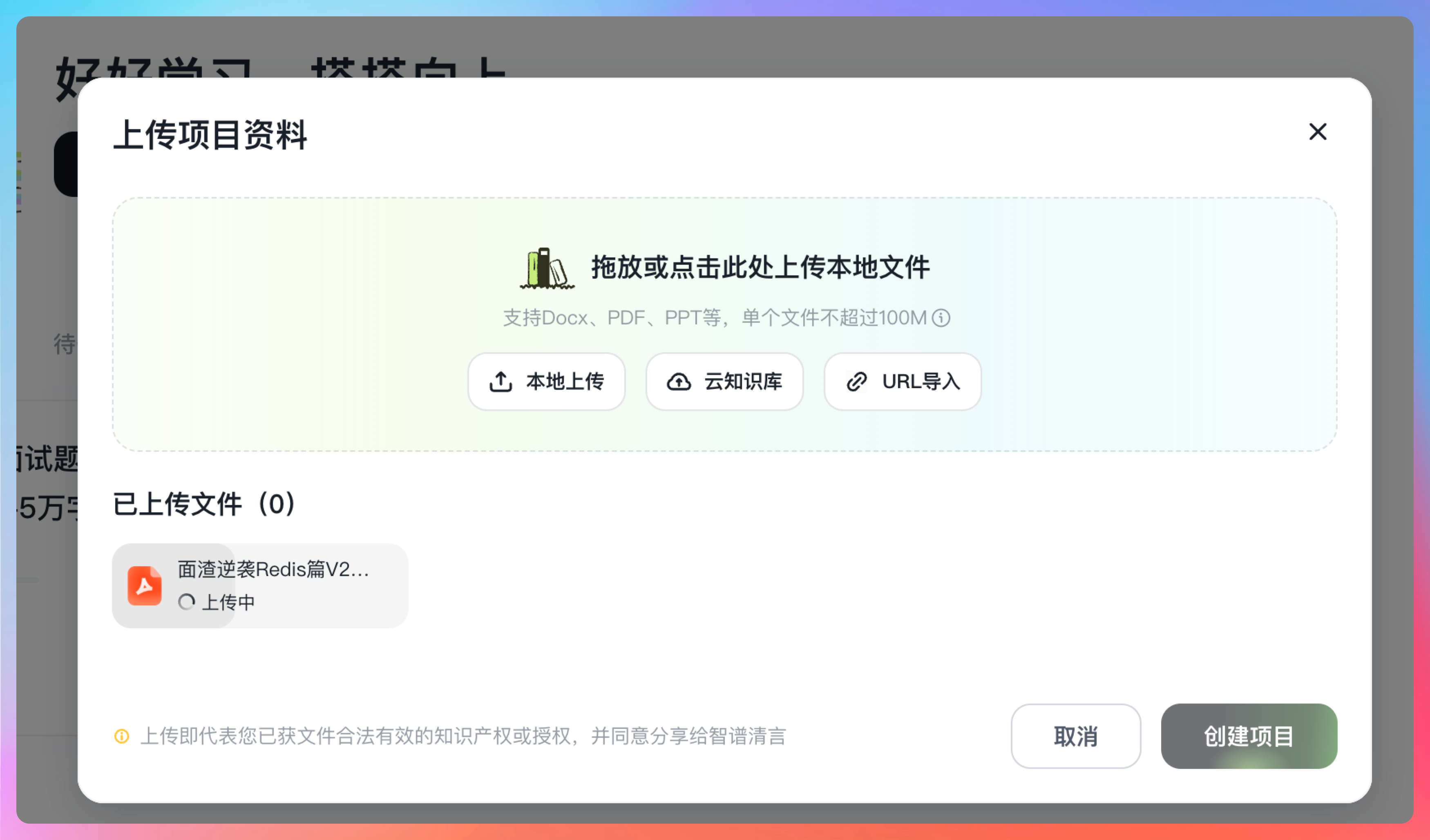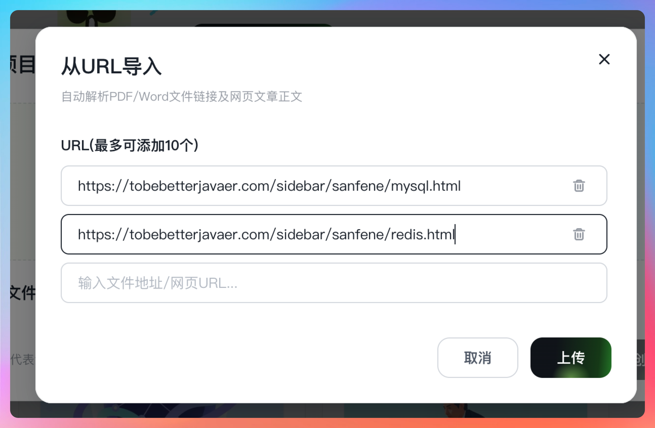 学习搭子目前支持三种方式,PDF、云知识库、URL 导入都可以。