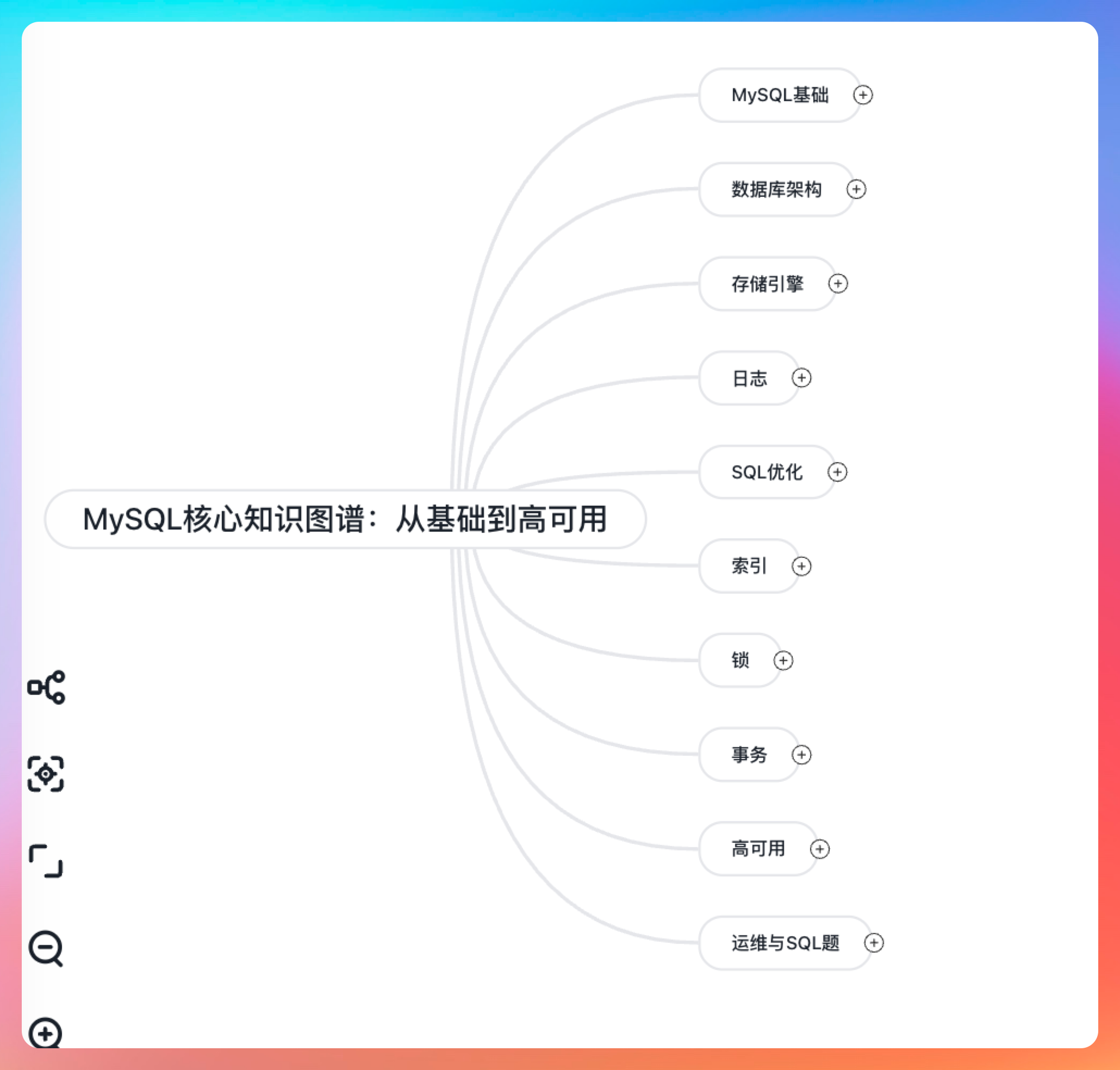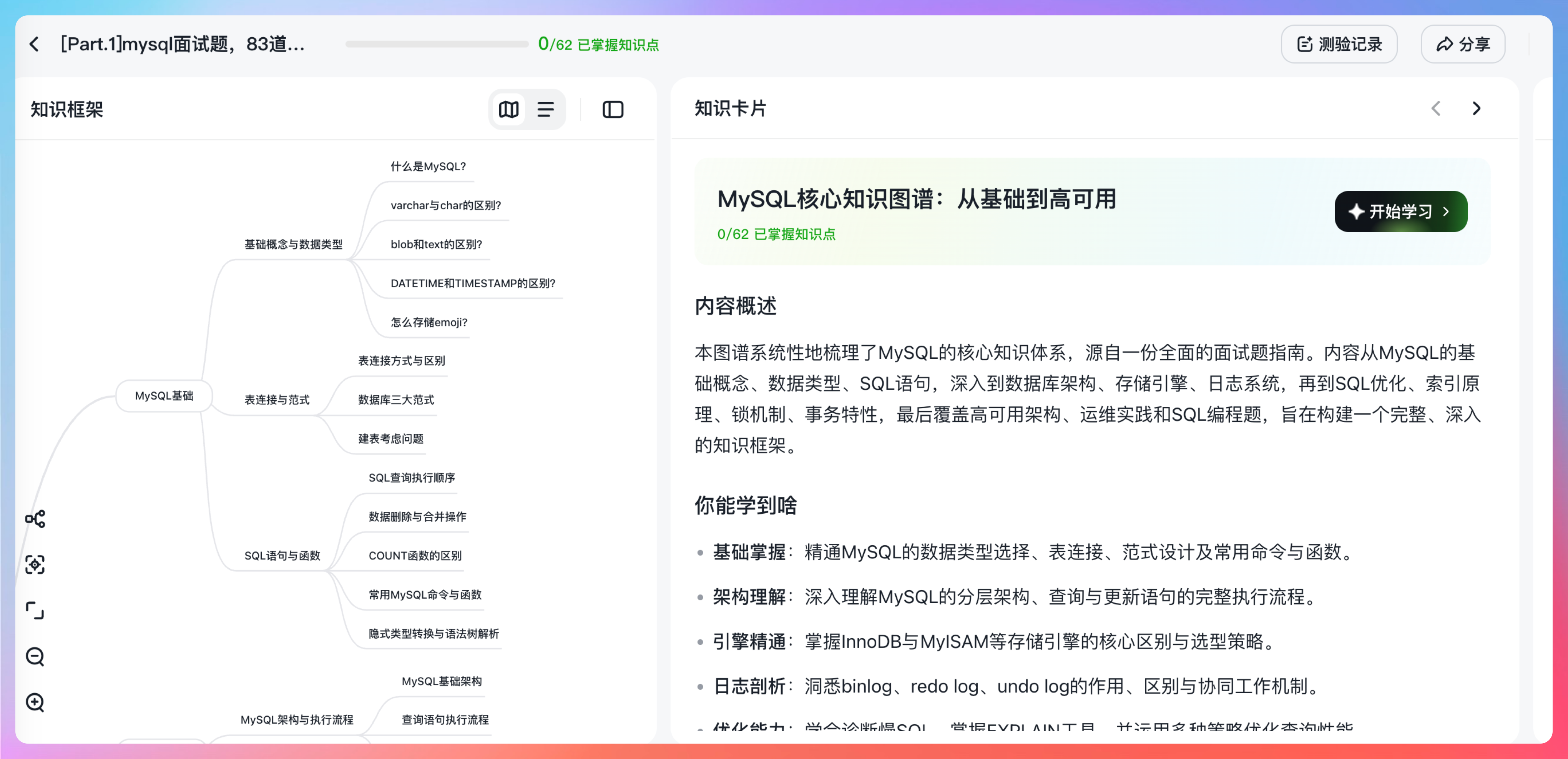 面渣逆袭MySQL篇上传成功后,学习搭子会帮我们理好知识框架,生成了由项目标题、具体章节、章节核心内容、具体知识点组成的四层思维导图。