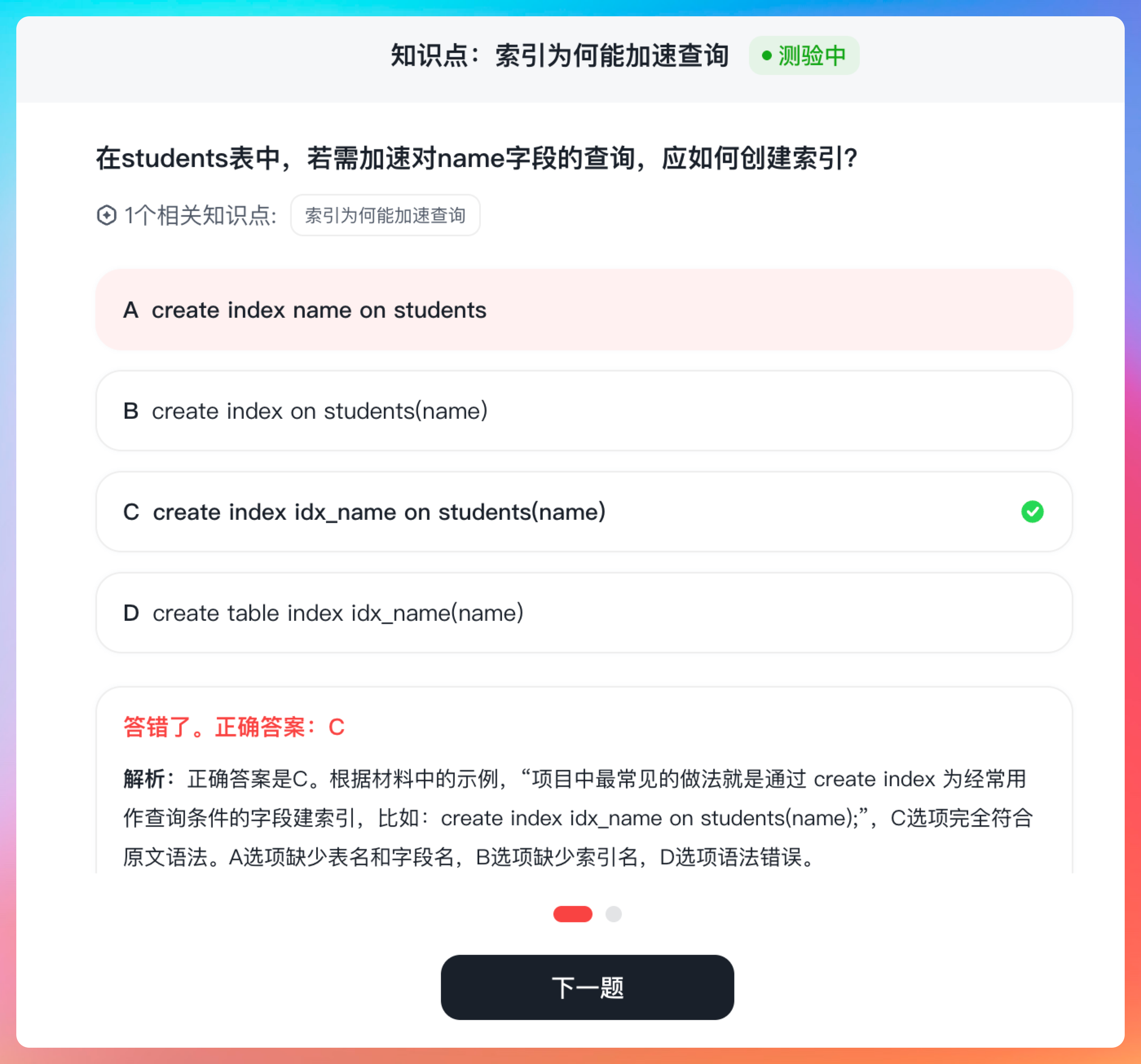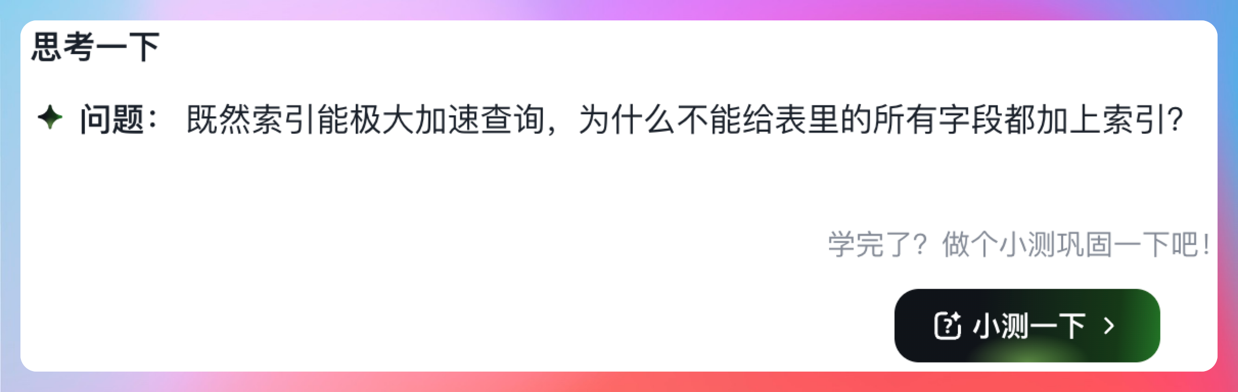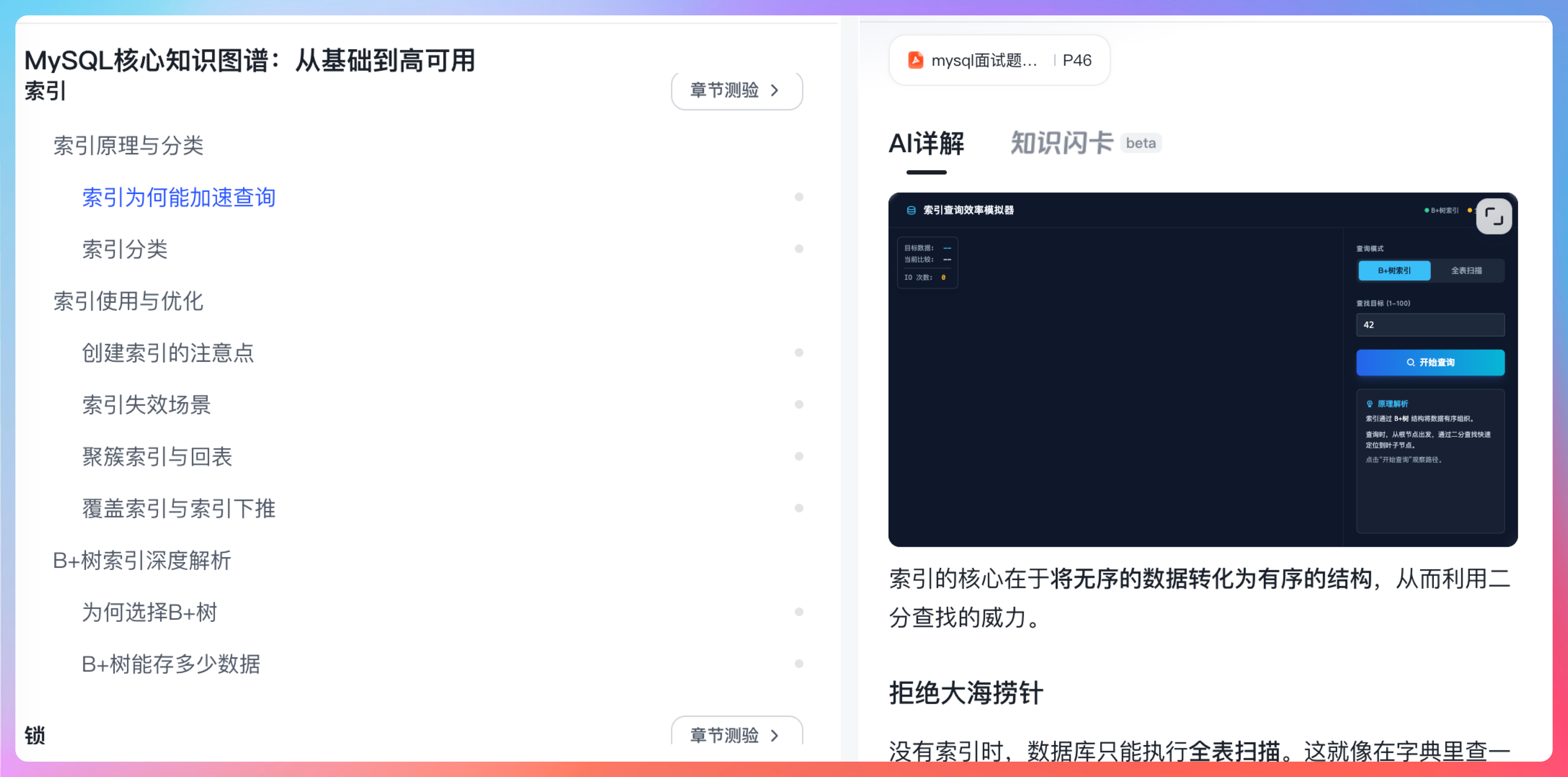 比如我点了"索引为何能加速查询"这个知识点,学习搭子先给我概述了索引的定义和作用,然后开始生成 AI 讲解。