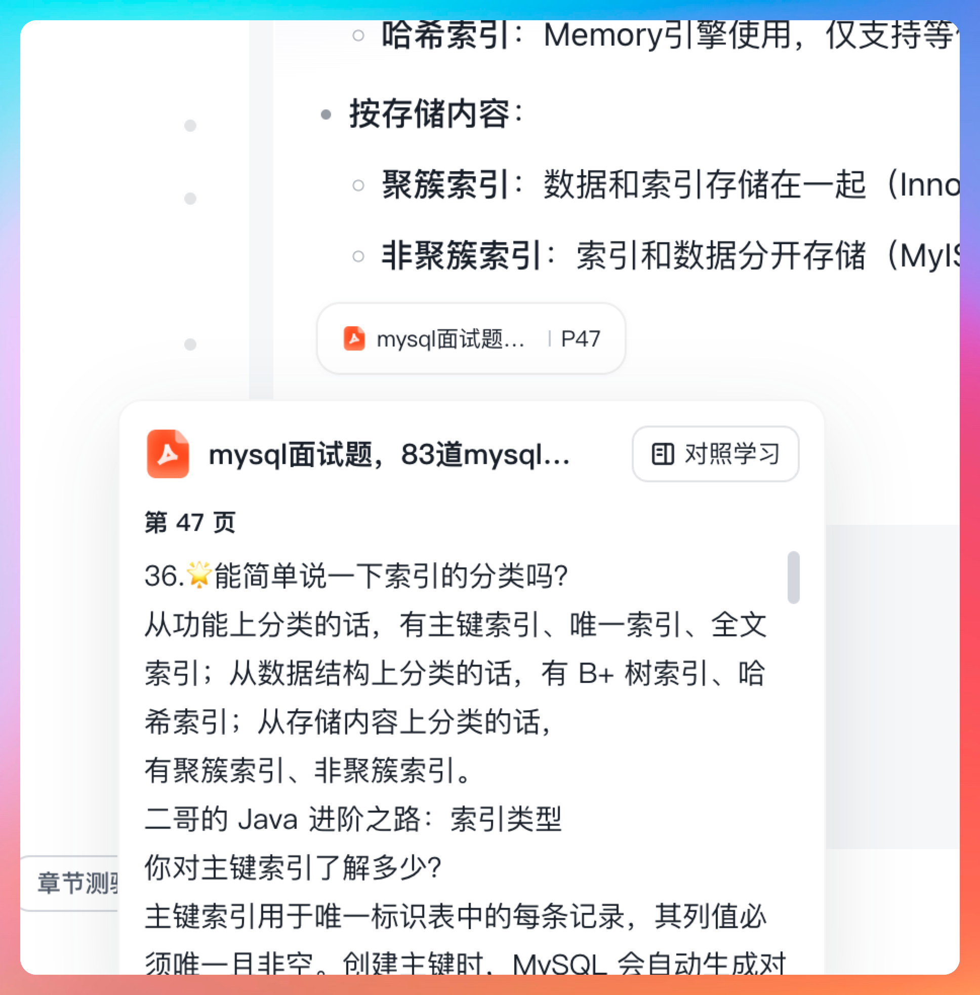 而且学习搭子有一个很贴心的设计:每个知识点都可以找到原资料对照。我不确定某个地方是不是面渣逆袭里说的,直接点一下就能跳转到原文网页,方便验证。
