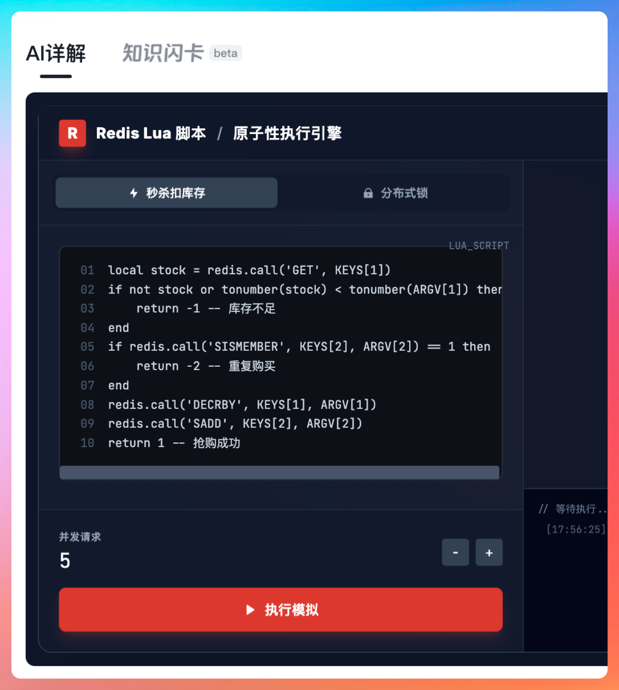 还有分布式锁这块,学习搭子创建了一个高并发场景的演示,多个请求同时来抢锁,setnx命令的执行过程、锁超时时间的设置、锁释放的时机,这些细节都用动画展示出来。