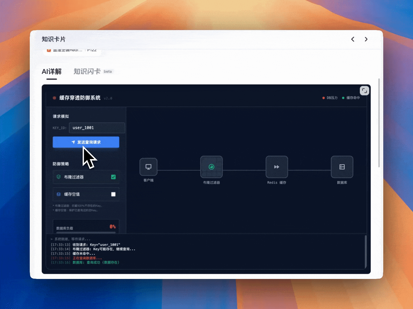 我点了"缓存穿透"这个知识点,学习搭子先给我概述了什么是缓存穿透,然后创建了请求流程的可视化演示。从客户端请求到Redis缓存,再到MySQL数据库,每一步都展示得很清楚。