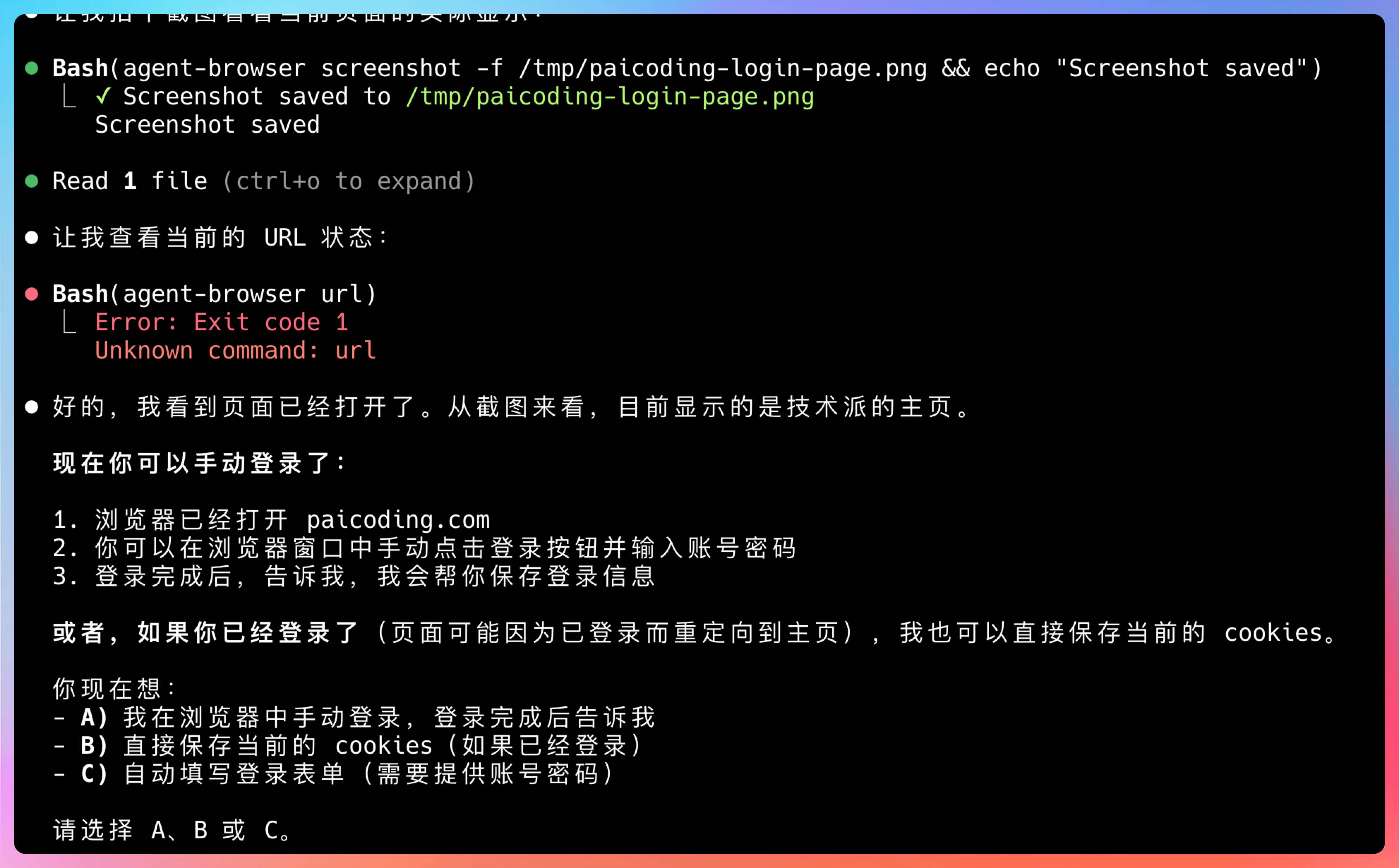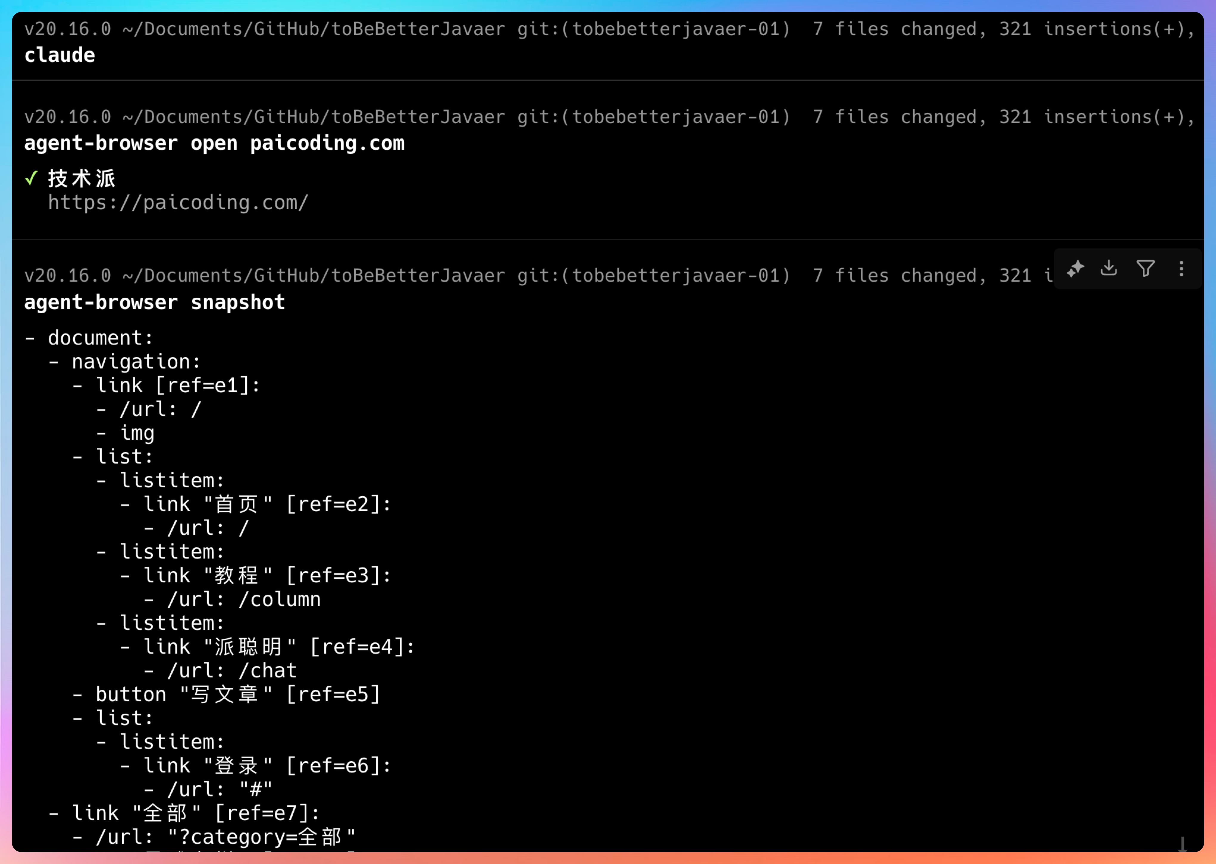 agent-browser --state ~/.paicoding-state.json open https://paicoding.com这个功能特别实用,我后续的所有操作都是基于这个已登录的会话,省去了重复登录的麻烦。