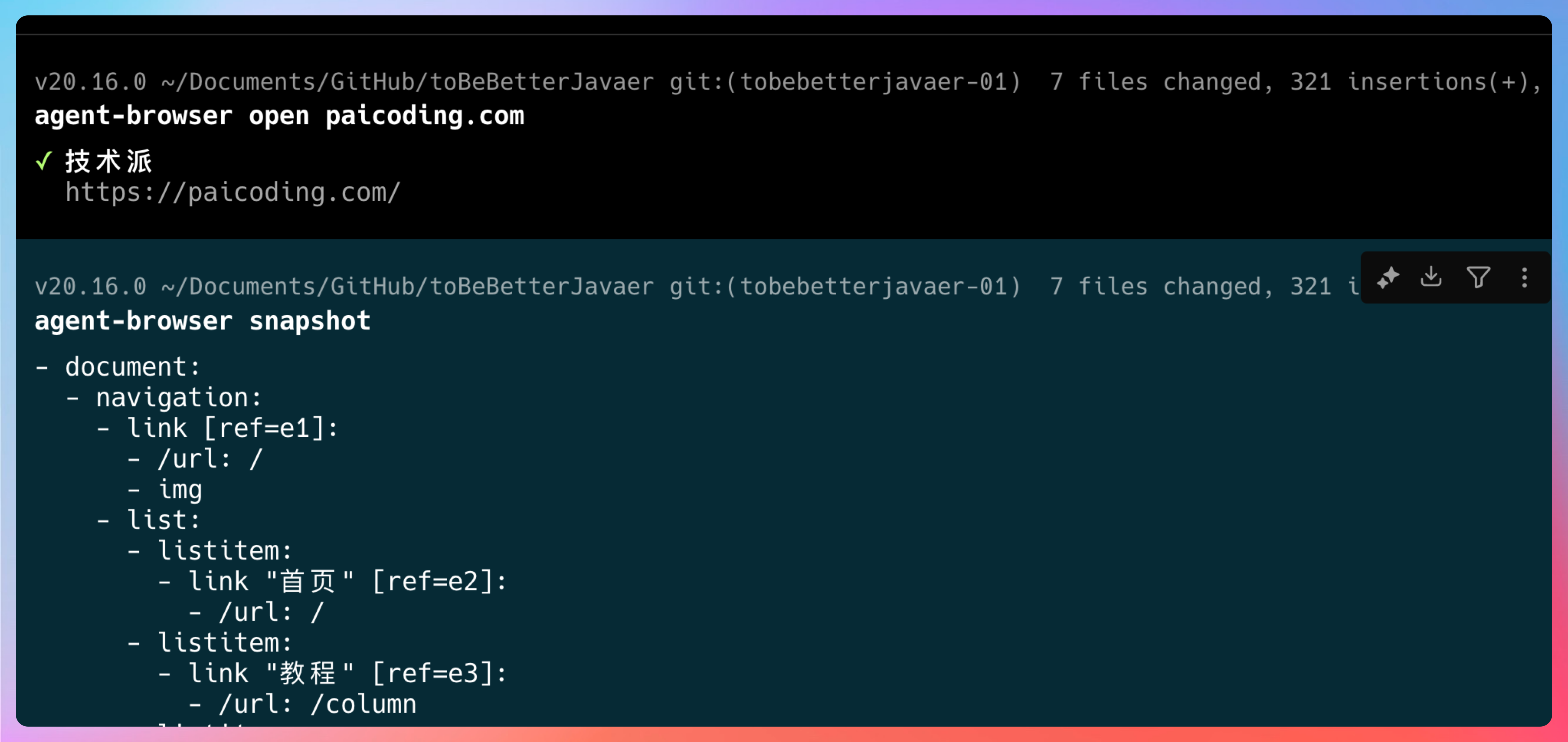 使用 agent-browser open paicoding.com 打开一个网页,agent-browser snapshot 可以获取当前页面的可交互元素引用。