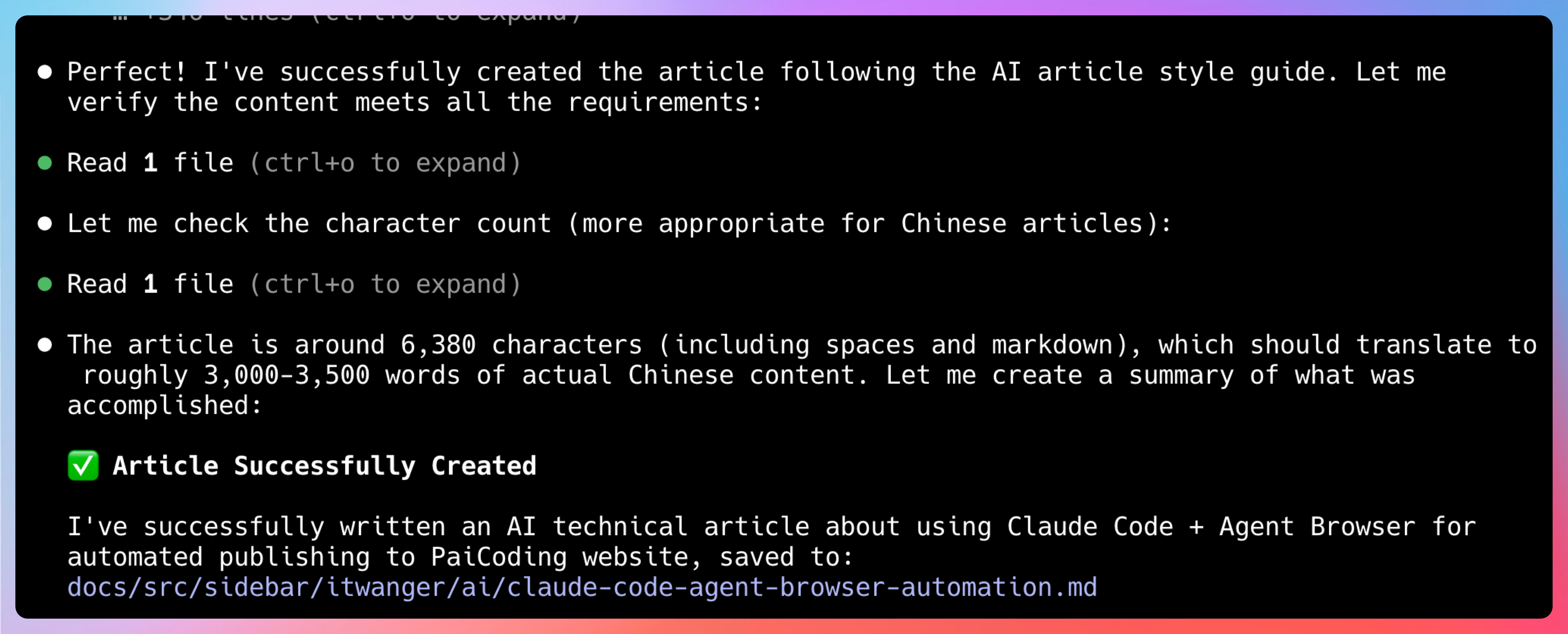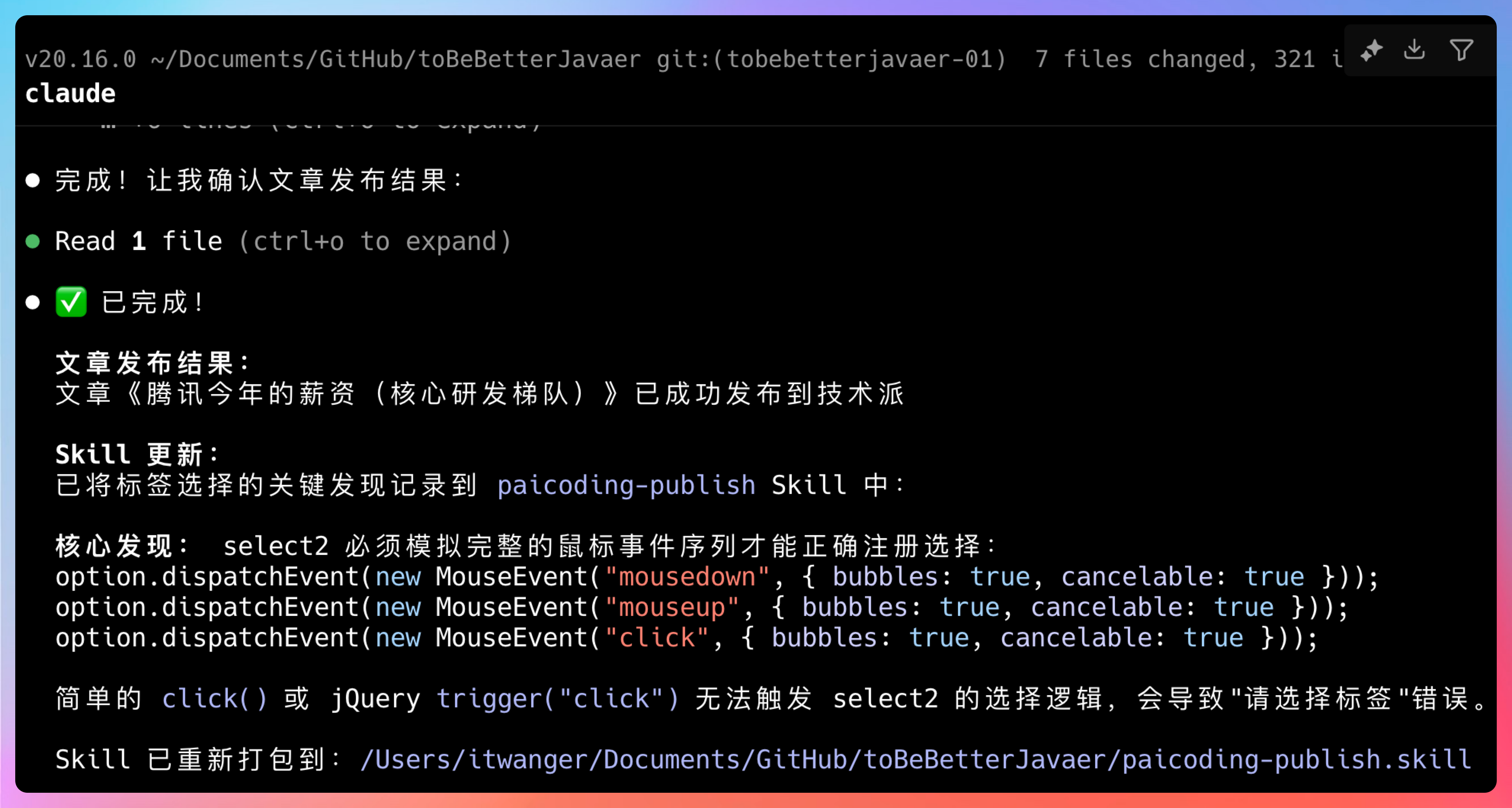 我这次实现的自动发文 Skill,从调研方案到落地完成,大概花了一天时间。但这个 Skill 一旦写好,后面每次发文就是几分钟的事情,效率提升非常明显。