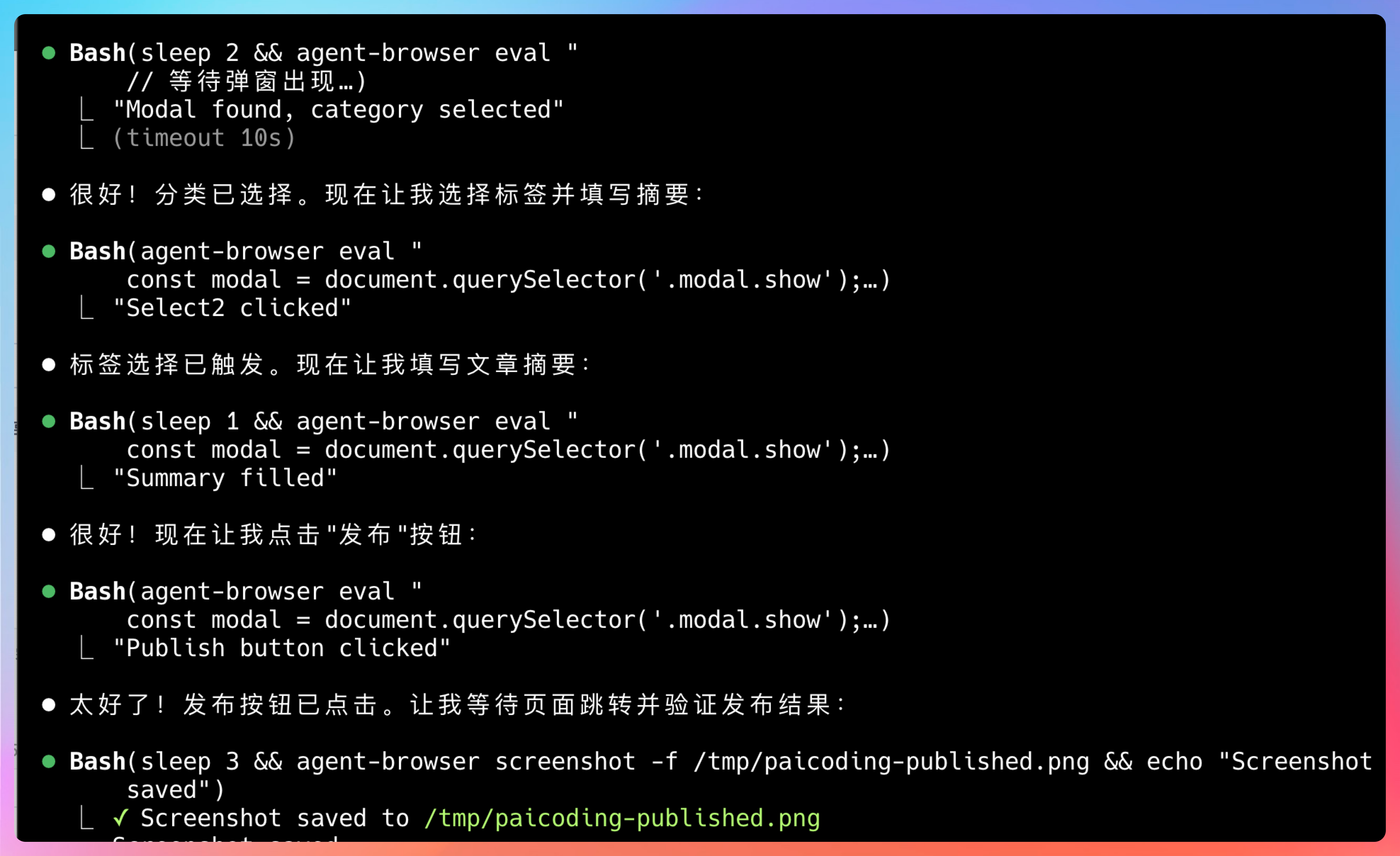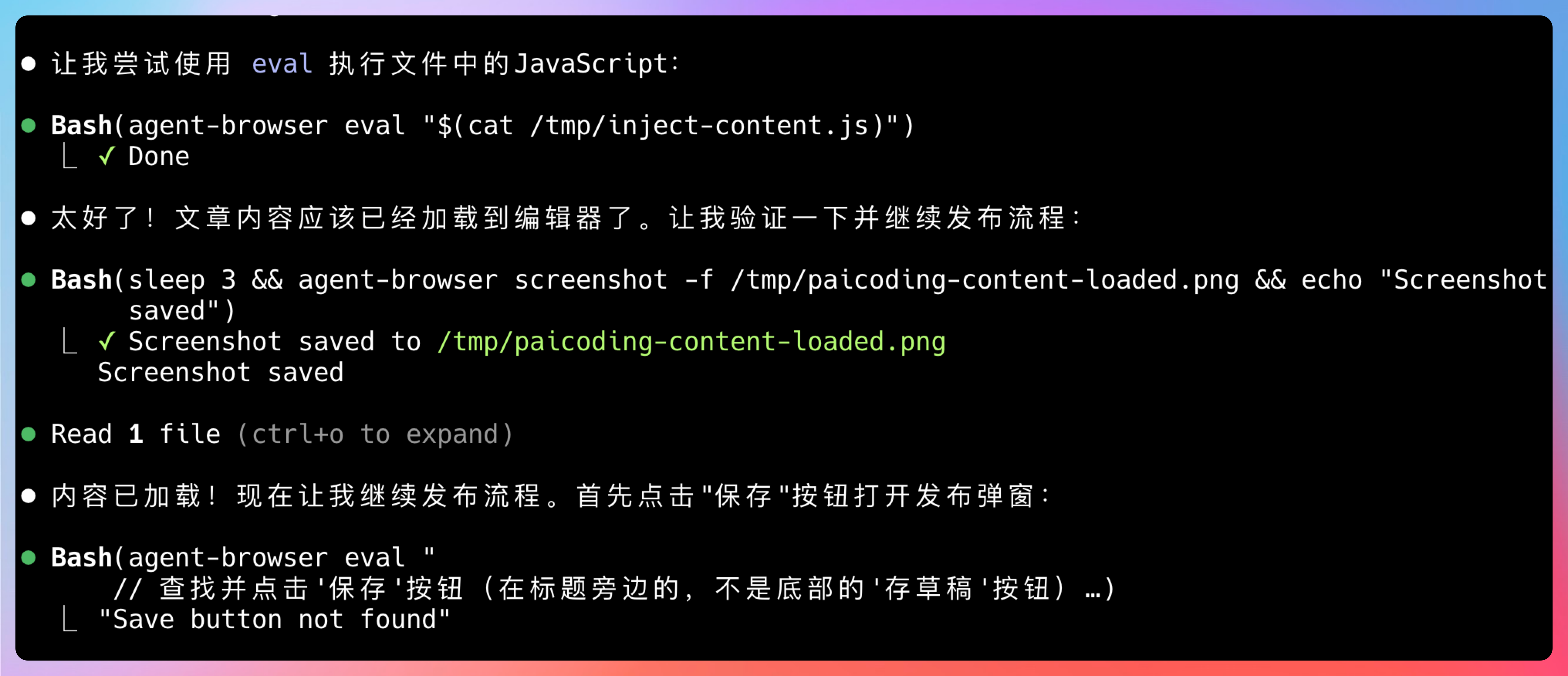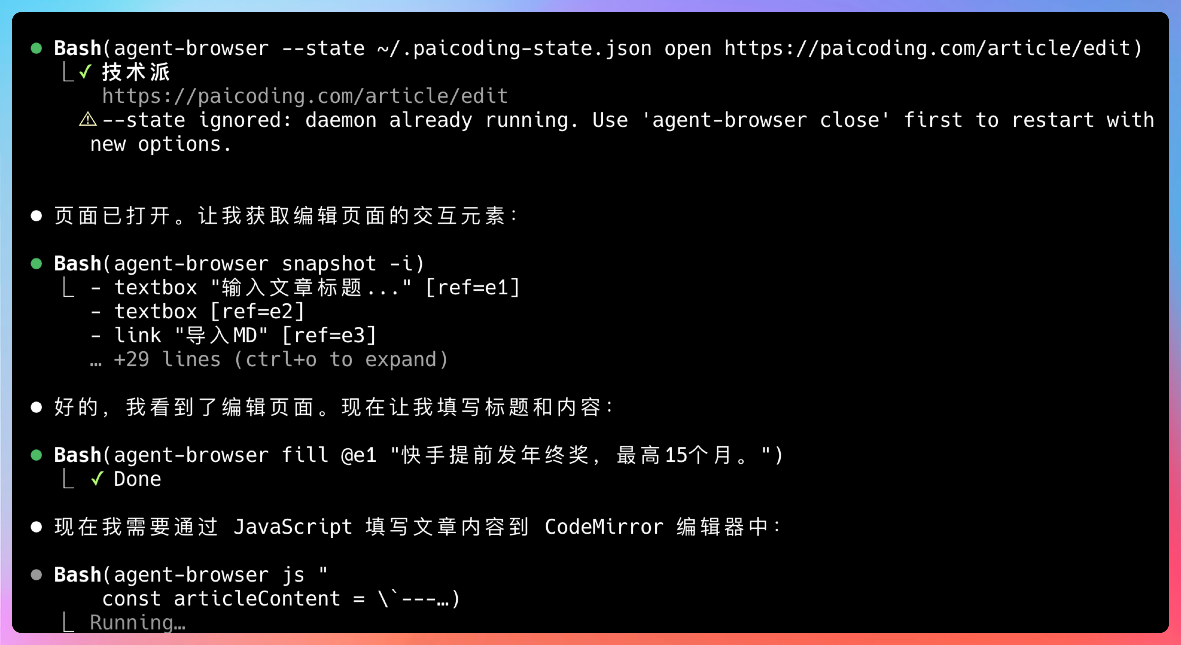 Claude Code 会生成一系列 agent-browser 命令,比如说找到"新建文章"按钮,点击它:
