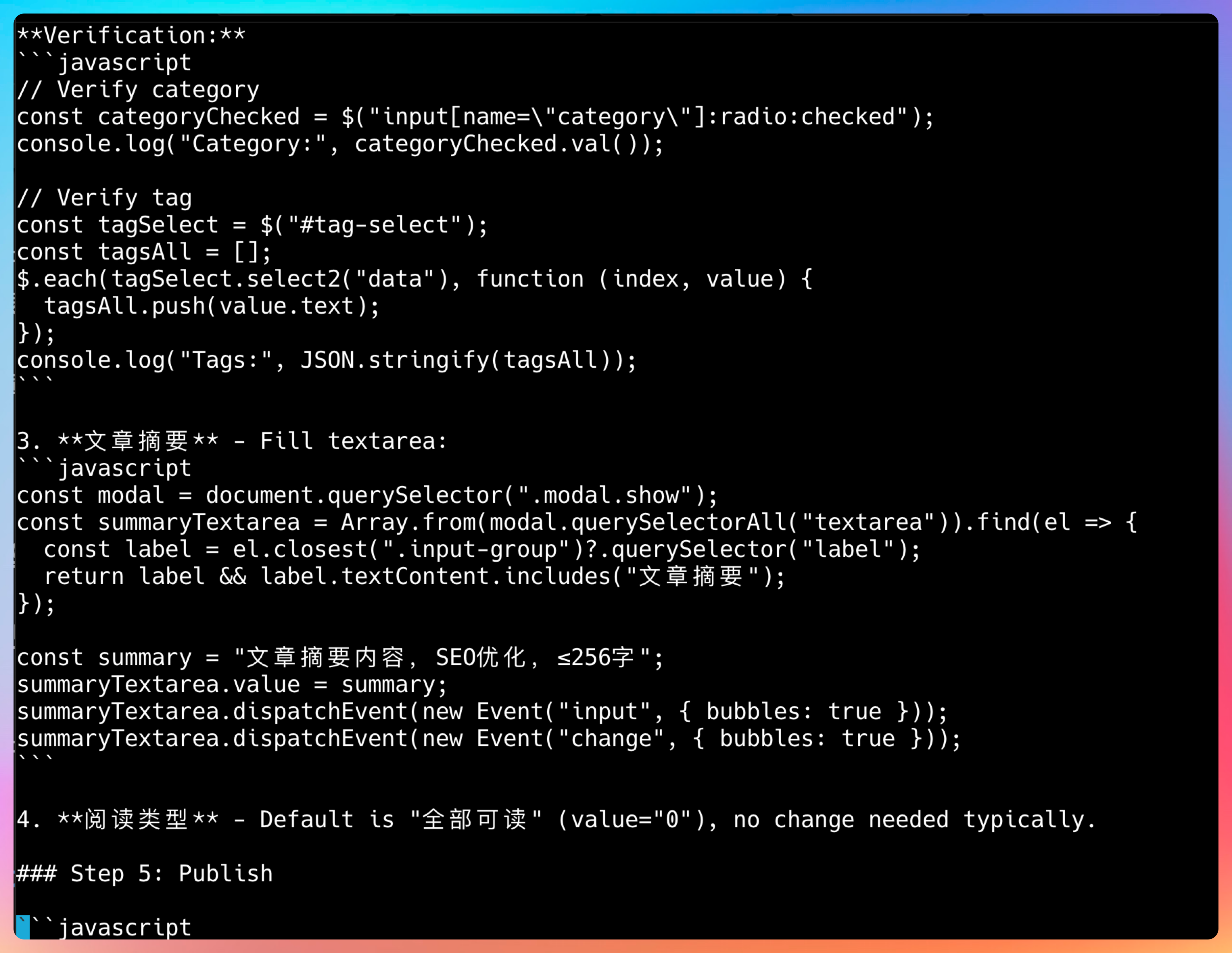 agent-browser upload @e6 "/path/to/kuaishou-year-end-bonus.md"接着就是把内容、标题、分类、标签、摘要这些信息填写完整: