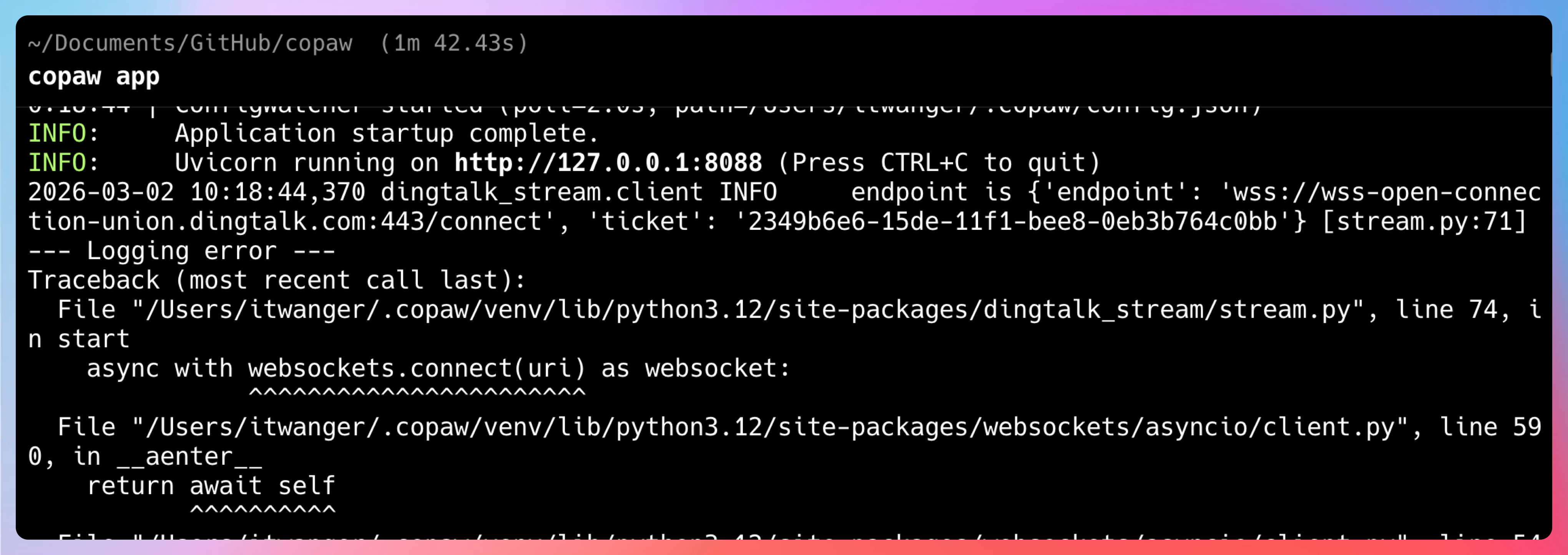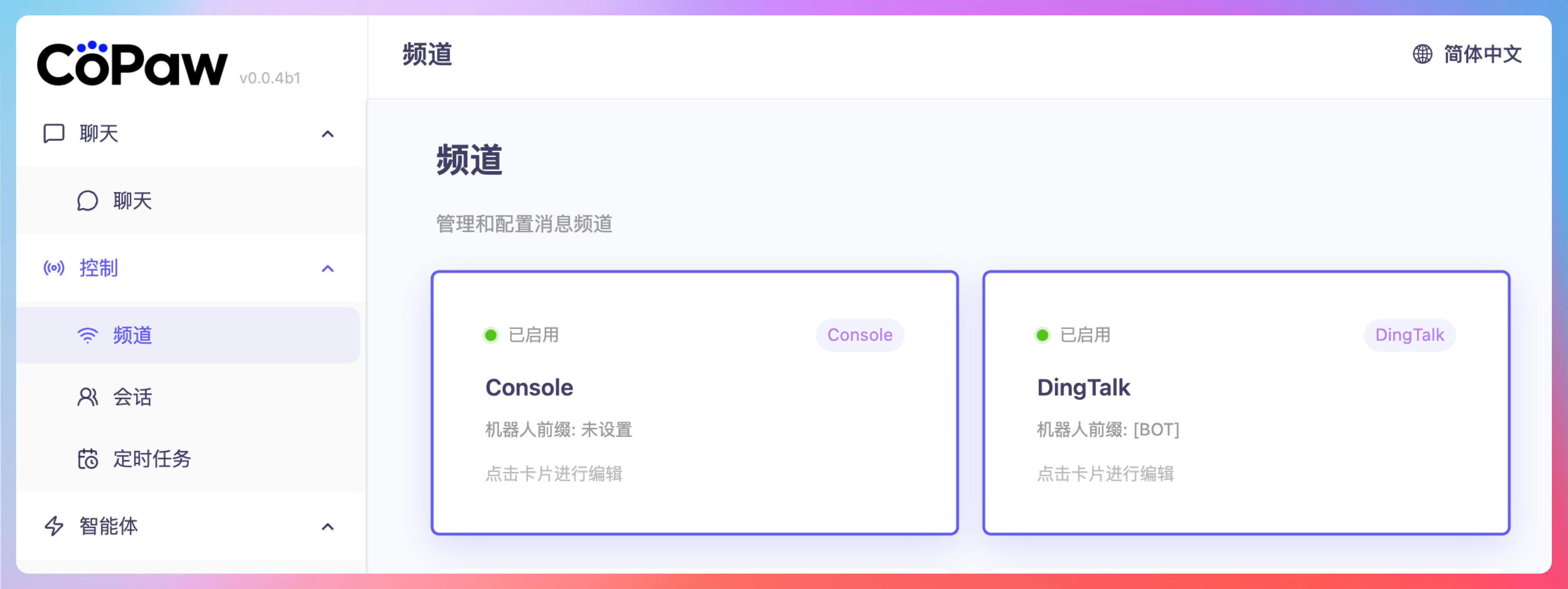 CoPaw 支持钉钉机器人接入,配置步骤如下: