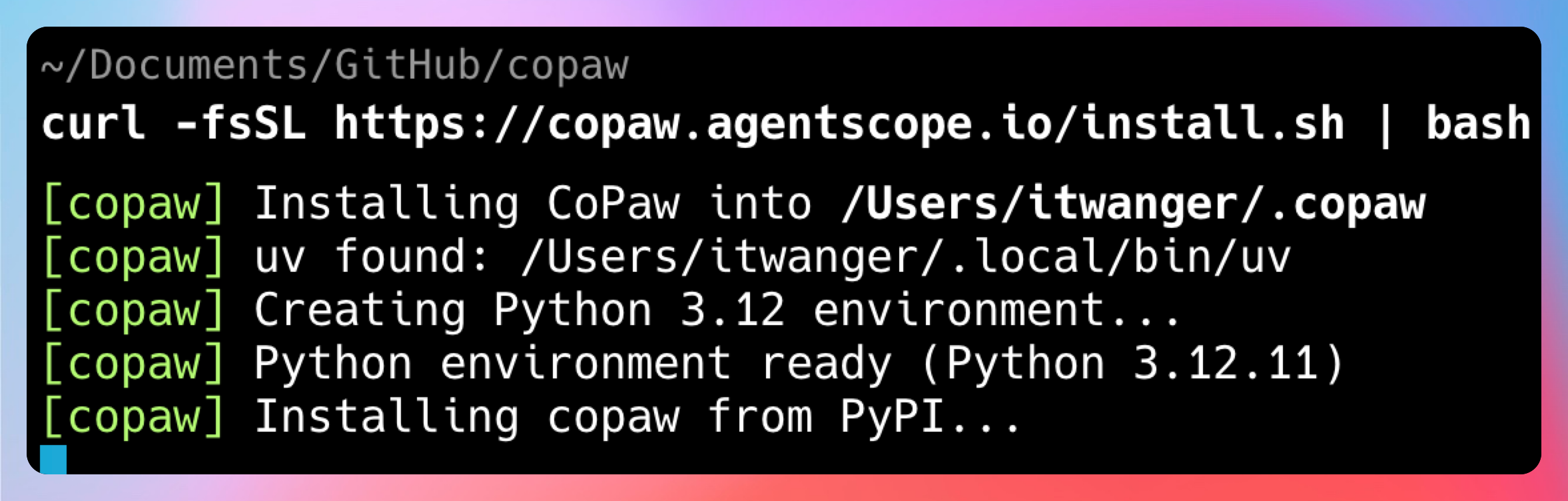 curl -fsSL https://copaw.agentscope.io/install.sh | bash