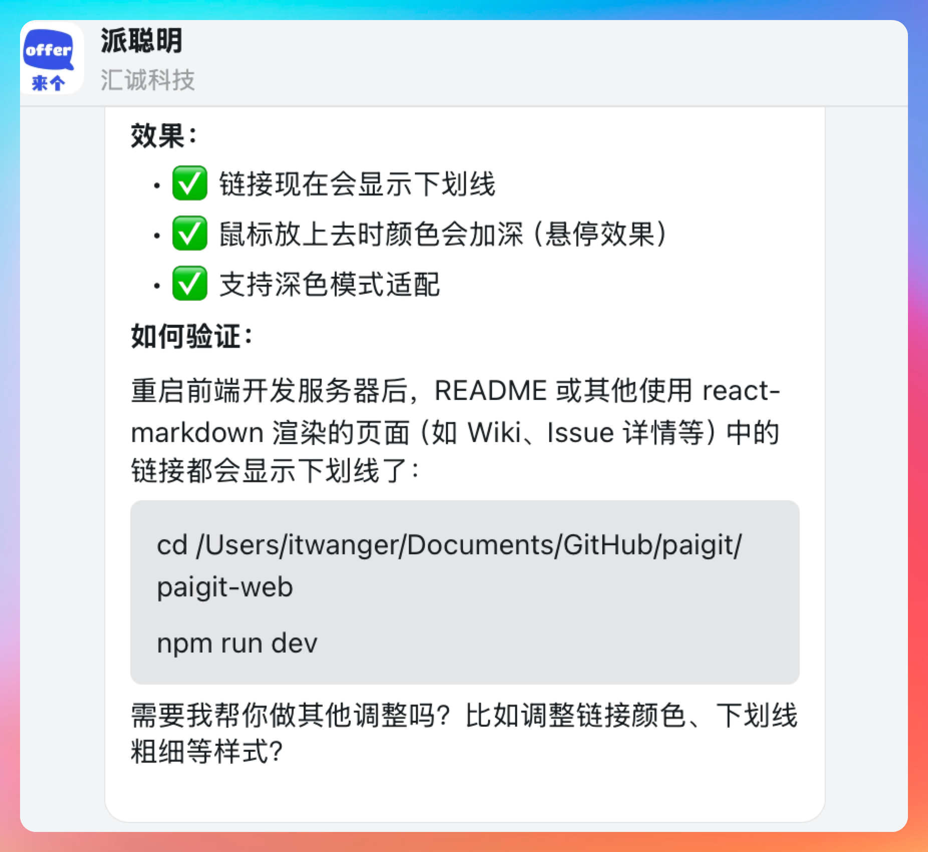 最后回复我已经修复了 README 中链接没有下划线的问题。 修改内容:在 paigit-web/src/app/globals.css 中添加了 Markdown 链接的样式。