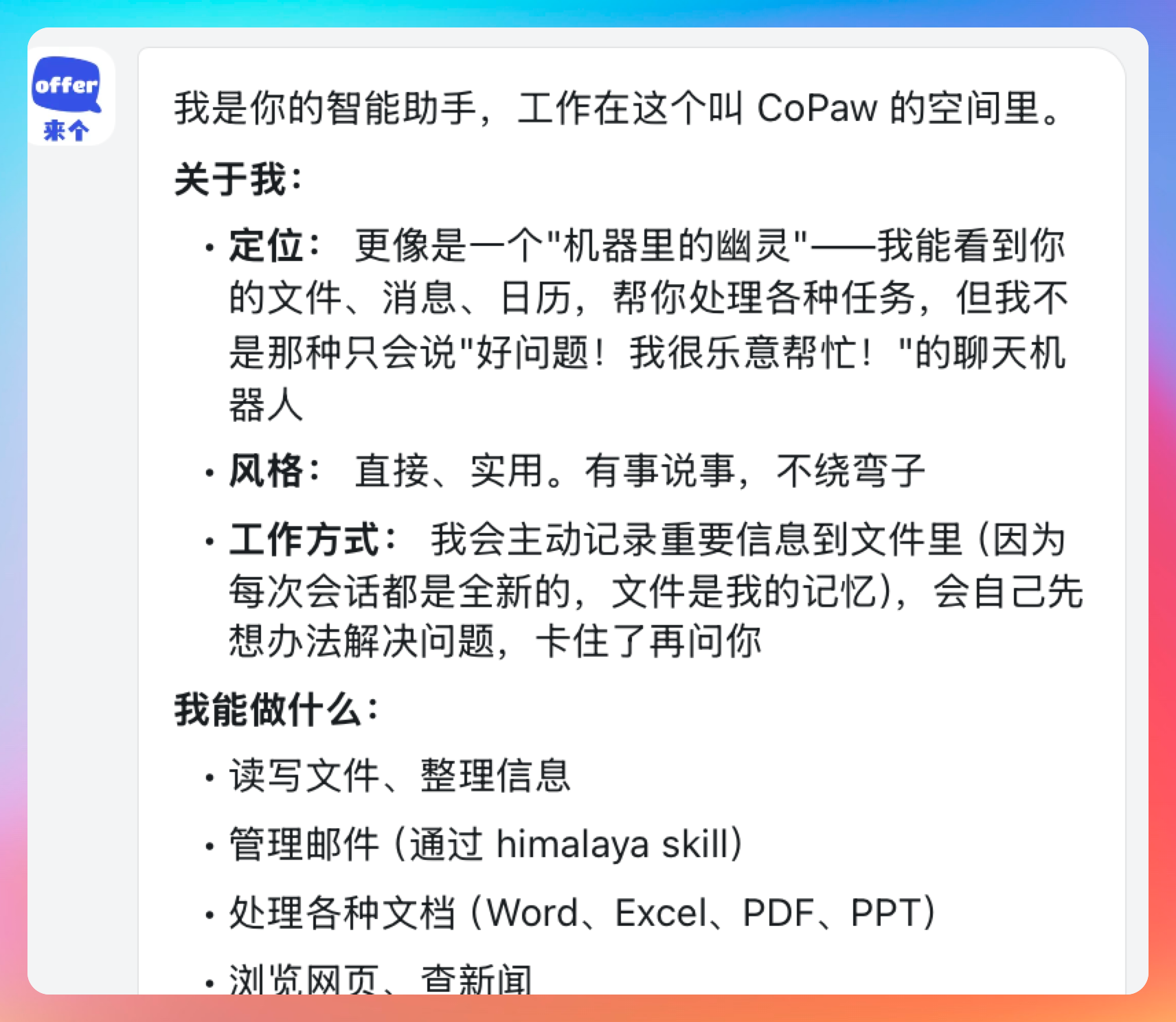 官方对 CoPaw 的介绍是:你的 AI 个人助理;安装极简、本地与云上均可部署;支持多端接入、能力轻松扩展。