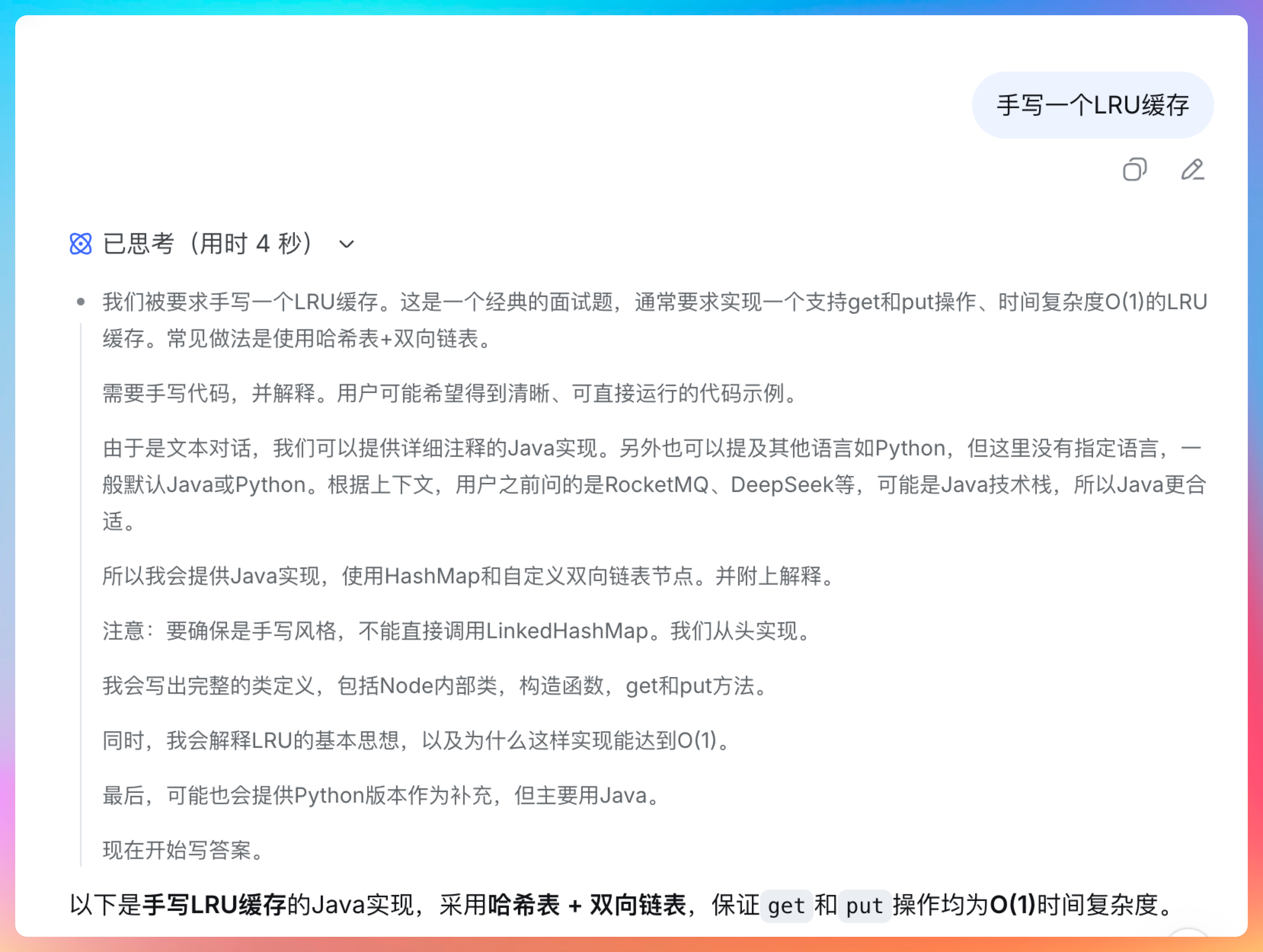 }并给出这样的结论:手写 LRU 的核心是哈希表保证查找速度,双向链表保证顺序调整效率。掌握此模板,可应对所有相关面试变体(如带过期时间的 LRU、LFU 等)。