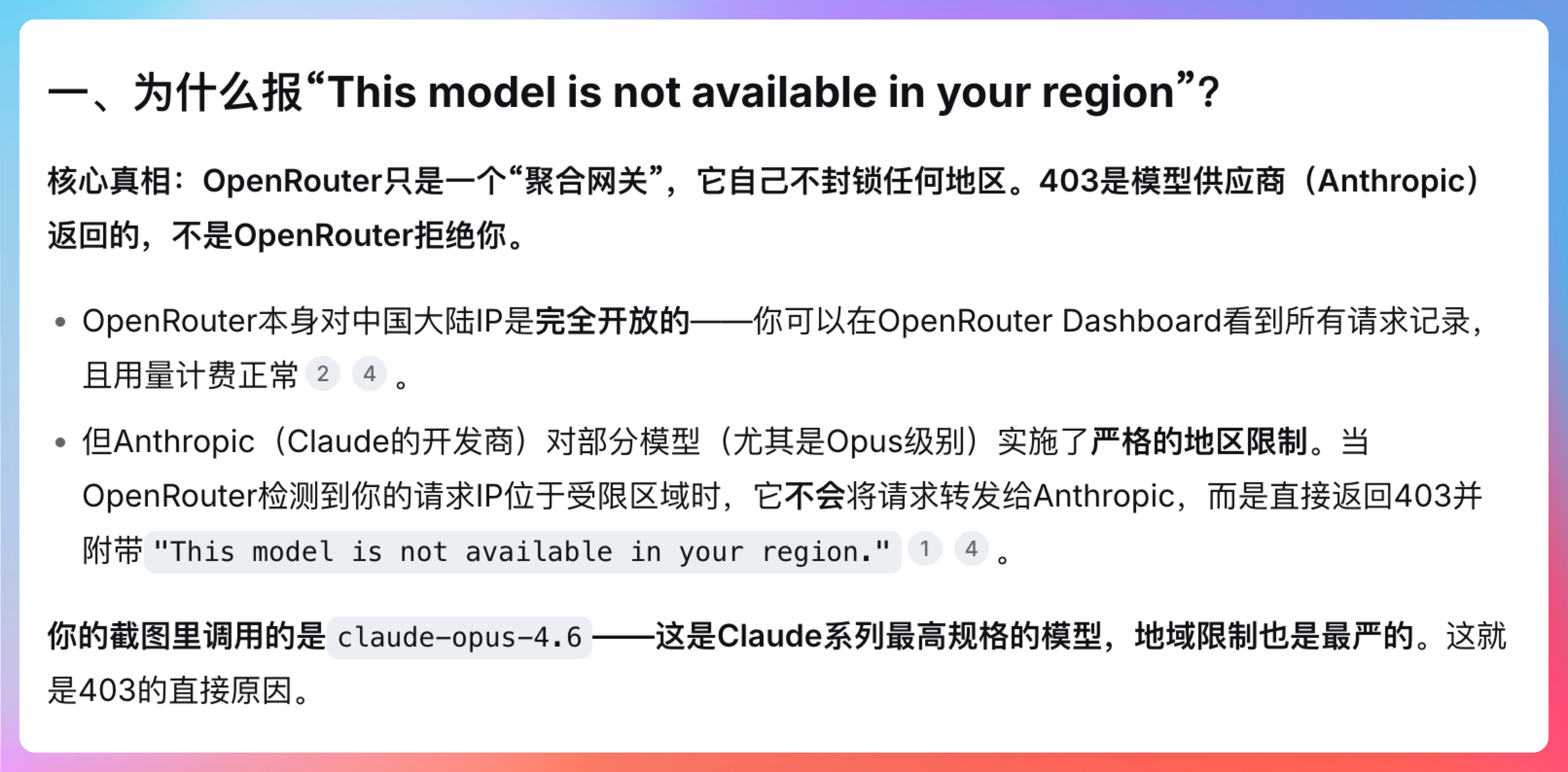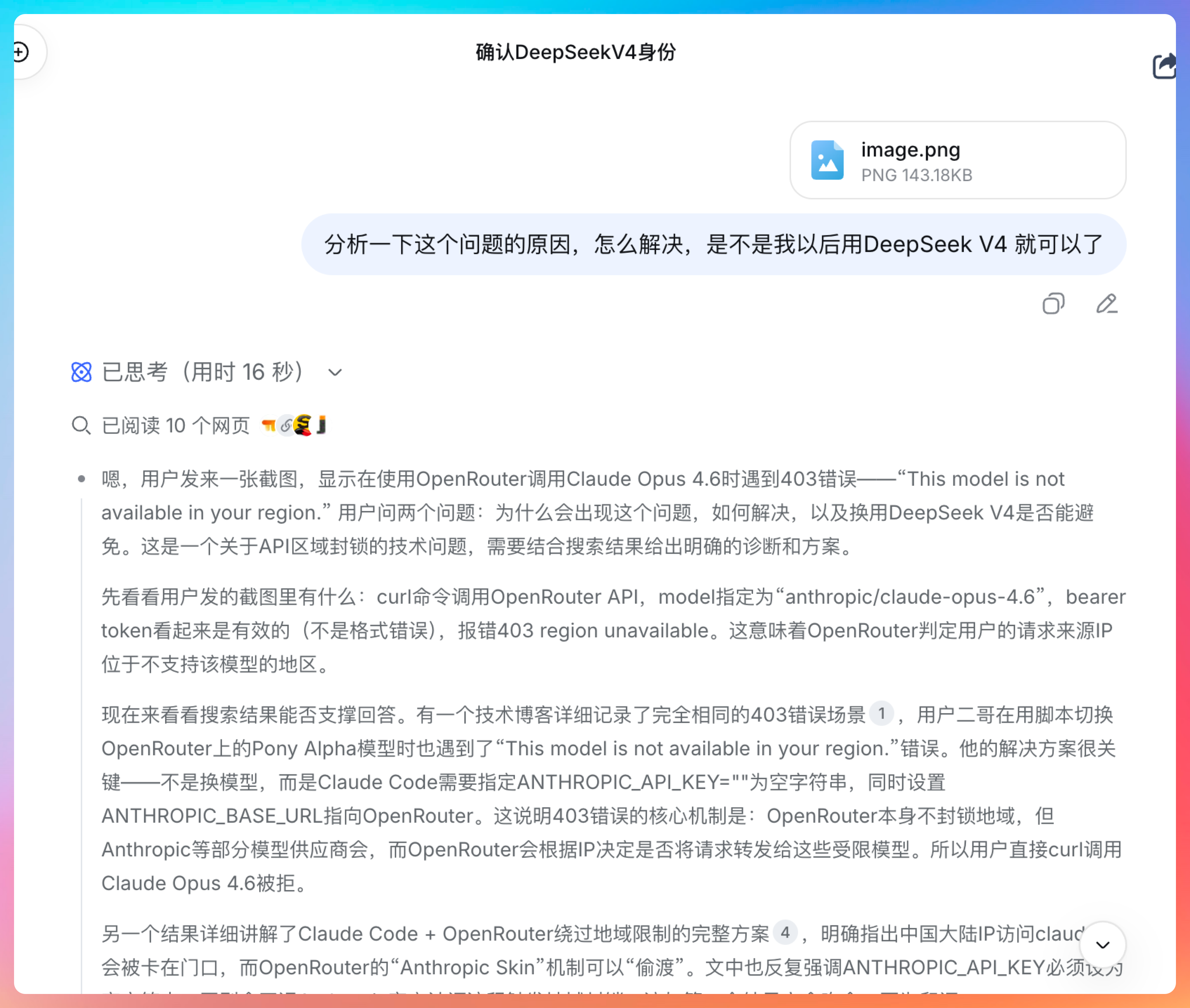 第五个测试,我刚好之前有遇到 Claude 4.6 无法使用的问题,来考考 DeepSeek V4 的反应。