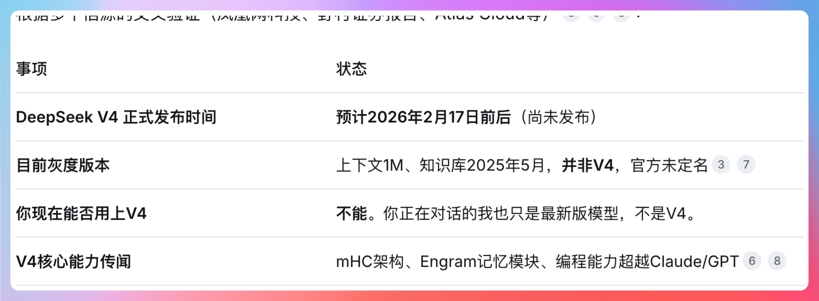 - V4 核心能力传闻:MoE 架构、Engram 记忆模块、编程能力超越 Claude/GPT