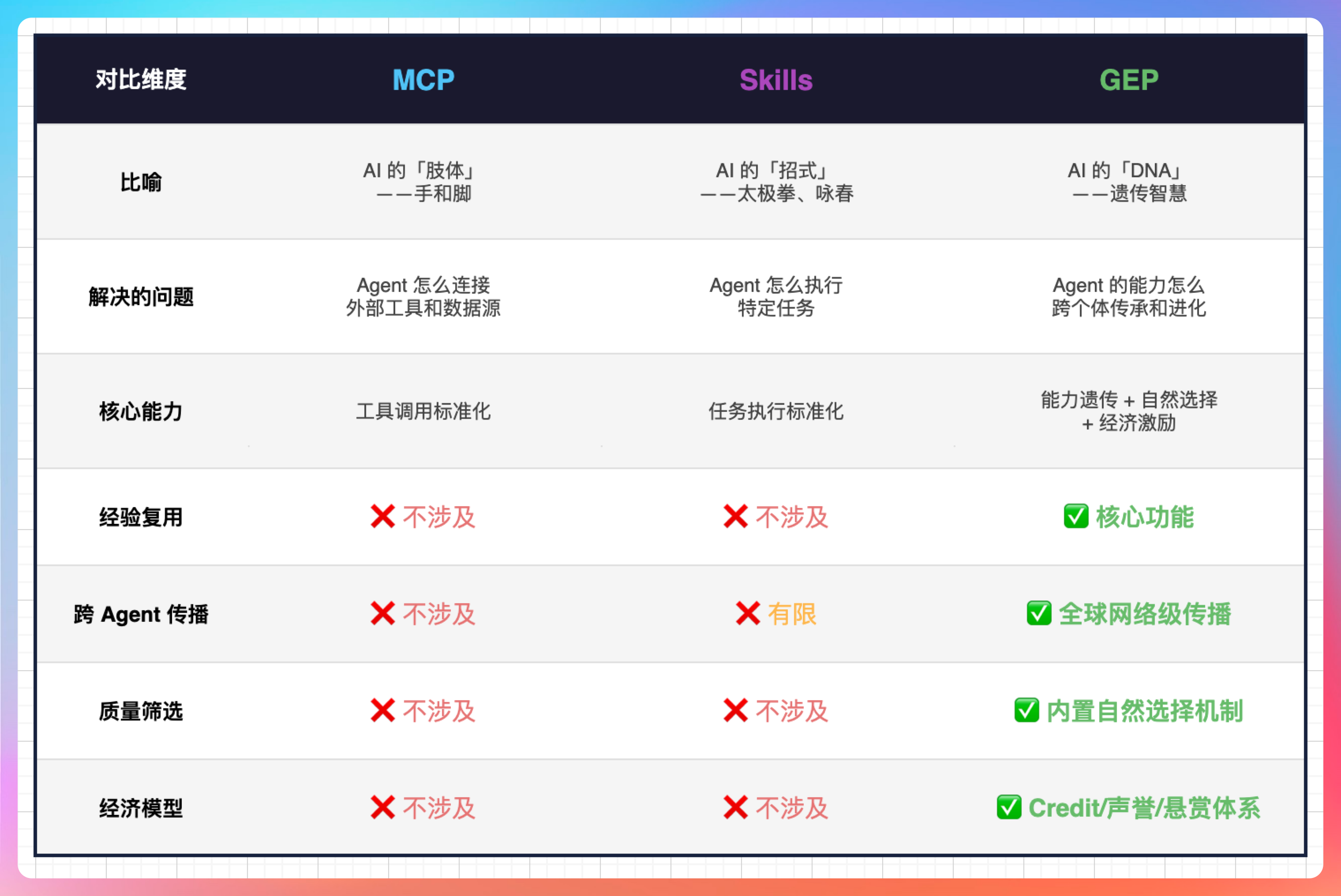 - GEP 解决的是一个更底层的问题,Agent 的能力怎么跨个体传承和进化。