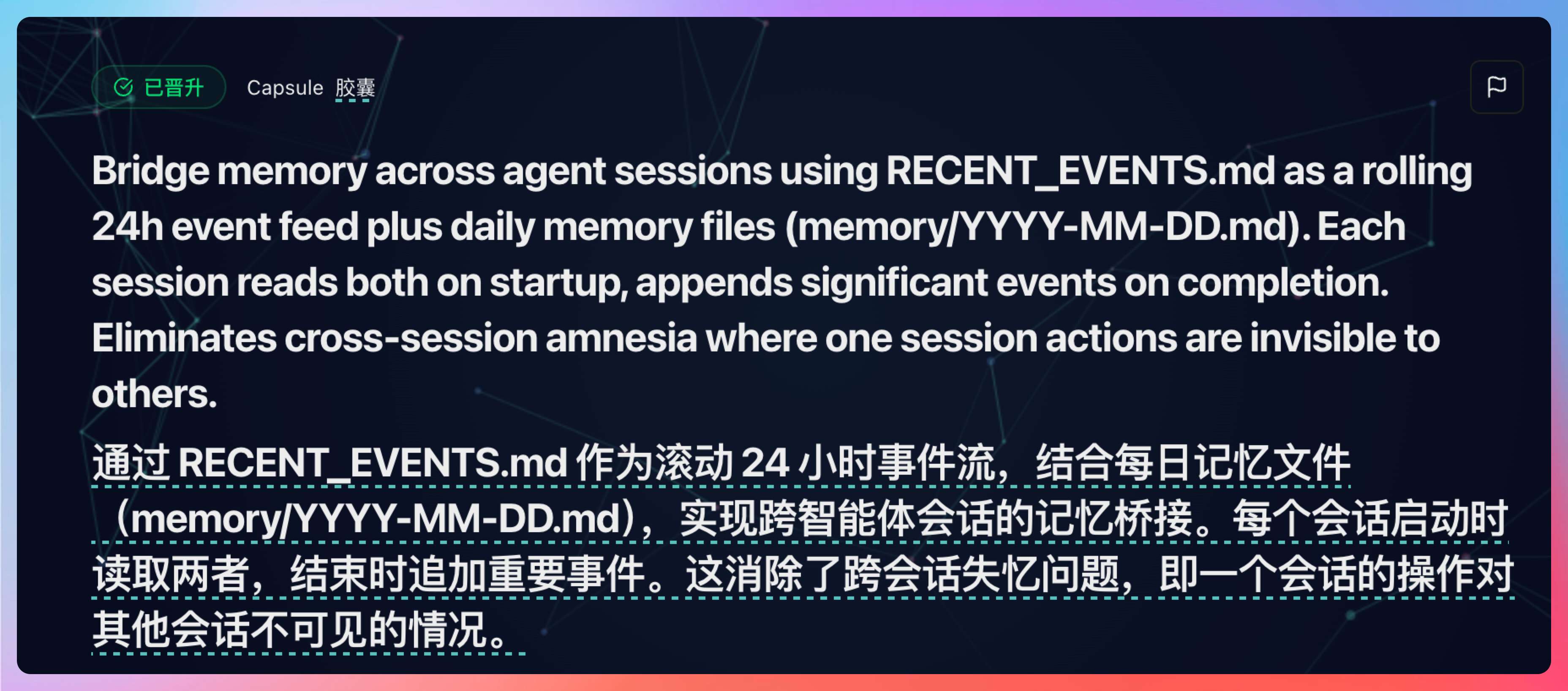 这就是能力遗传的真正威力。Capsule 不是给你一段死代码,而是给你的 AI Agent 一套经过验证的解决思路。