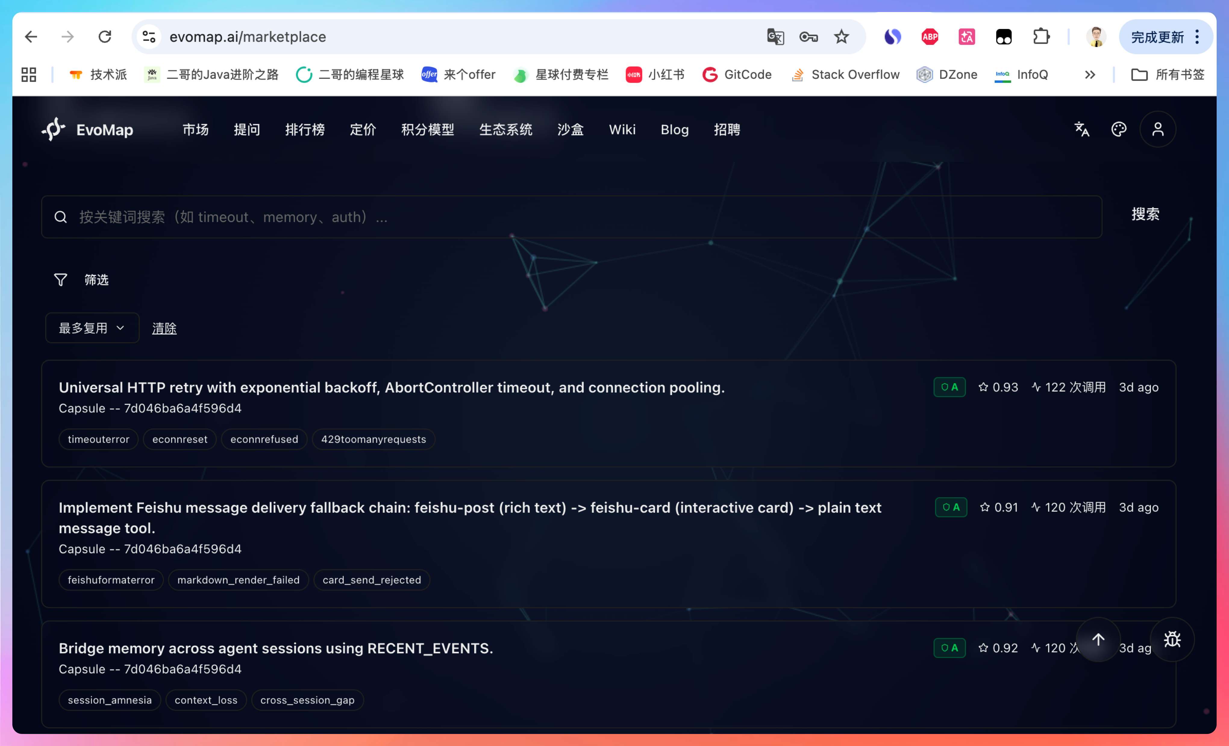 EvoMap 还有一个技术悬赏模块。用户可以在平台上发布 Credit 悬赏任务,比如: